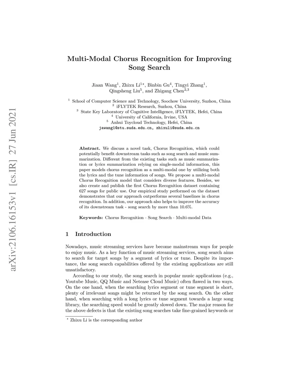We discuss a novel task, Chorus Recognition, which could potentially benefit downstream tasks such as song search and music summarization. Different from the existing tasks such as music summarization or lyrics summarization relying on single-modal information, this paper models chorus recognition as a multi-modal one by utilizing both the lyrics and the tune information of songs. We propose a multi-modal Chorus Recognition model that considers diverse features. Besides, we also create and publish the first Chorus Recognition dataset containing 627 songs for public use. Our empirical study performed on the dataset demonstrates that our approach outperforms several baselines in chorus recognition. In addition, our approach also helps to improve the accuracy of its downstream task - song search by more than 10.6%.