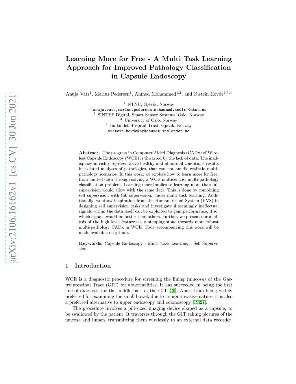 The progress in Computer Aided Diagnosis (CADx) of Wireless Capsule Endoscopy (WCE) is thwarted by the lack of data. The inadequacy in richly representative healthy and abnormal conditions results in isolated analyses of pathologies, that can not handle realistic multi-pathology scenarios. In this work, we explore how to learn more for free, from limited data through solving a WCE multicentric, multi-pathology classification problem. Learning more implies to learning more than full supervision would allow with the same data. This is done by combining self supervision with full supervision, under multi task learning. Additionally, we draw inspiration from the Human Visual System (HVS) in designing self supervision tasks and investigate if seemingly ineffectual signals within the data itself can be exploited to gain performance, if so, which signals would be better than others. Further, we present our analysis of the high level features as a stepping stone towards more robust multi-pathology CADx in WCE.