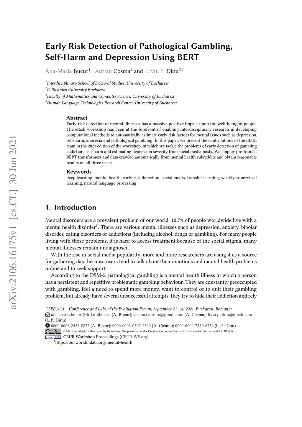 Early Risk Detection of Pathological Gambling, Self-Harm and Depression