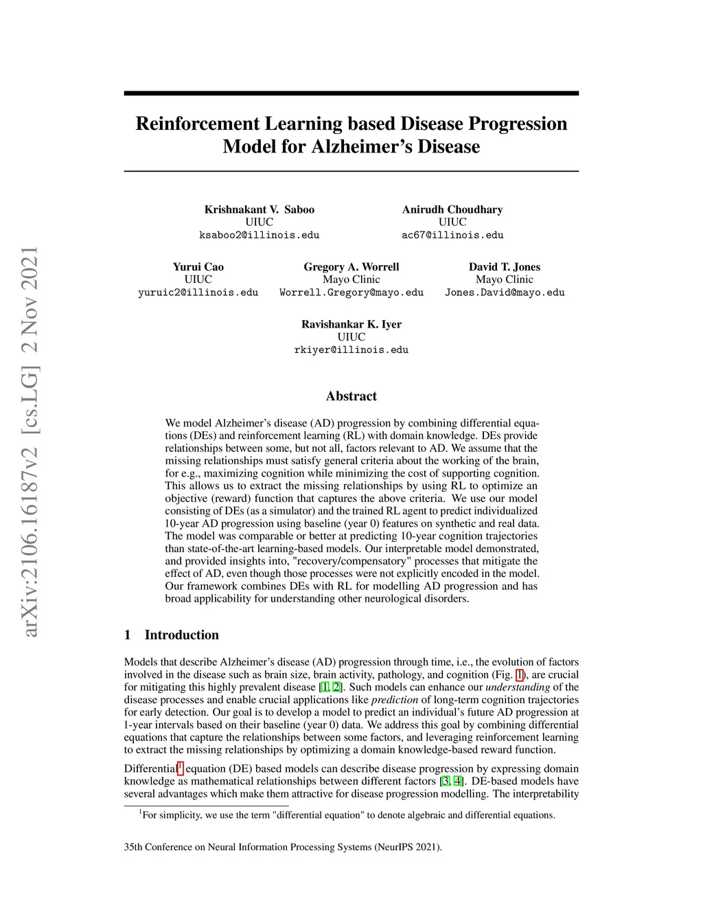 We model Alzheimer's disease (AD) progression by combining differential equations (DEs) and reinforcement learning (RL) with domain knowledge. DEs provide relationships between some, but not all, factors relevant to AD. We assume that the missing relationships must satisfy general criteria about the working of the brain, for e.g., maximizing cognition while minimizing the cost of supporting cognition. This allows us to extract the missing relationships by using RL to optimize an objective (reward) function that captures the above criteria. We use our model consisting of DEs (as a simulator) and the trained RL agent to predict individualized 10-year AD progression using baseline (year 0) features on synthetic and real data. The model was comparable or better at predicting 10-year cognition trajectories than state-of-the-art learning-based models. Our interpretable model demonstrated, and provided insights into, "recovery/compensatory" processes that mitigate the effect of AD, even though those processes were not explicitly encoded in the model. Our framework combines DEs with RL for modelling AD progression and has broad applicability for understanding other neurological disorders.