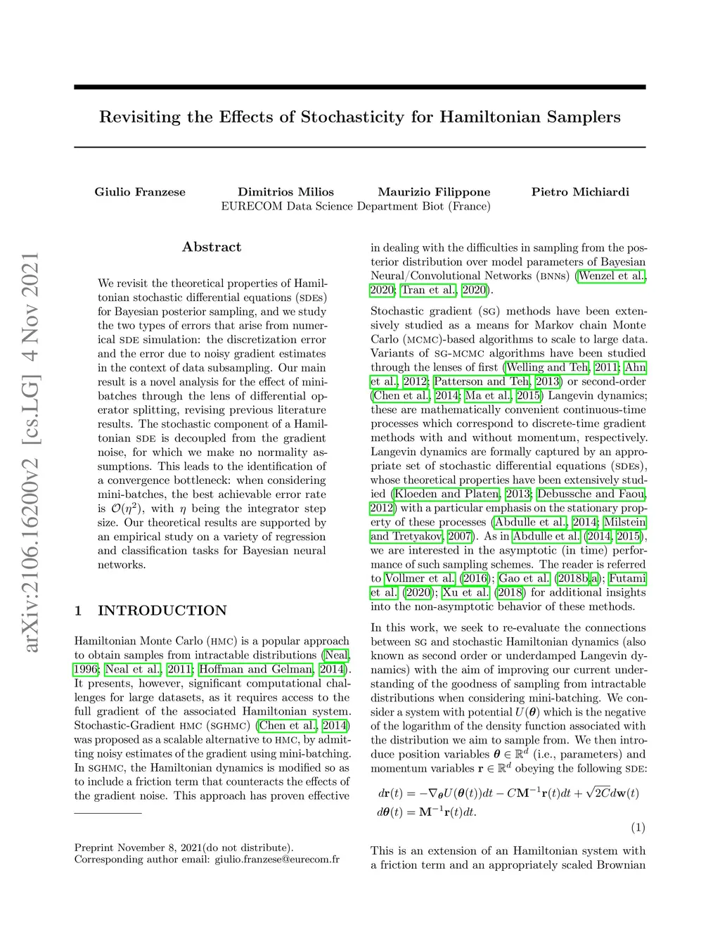 We revisit the theoretical properties of Hamiltonian stochastic differential equations (SDES) for Bayesian posterior sampling, and we study the two types of errors that arise from numerical SDE simulation: the discretization error and the error due to noisy gradient estimates in the context of data subsampling. Our main result is a novel analysis for the effect of mini-batches through the lens of differential operator splitting, revising previous literature results. The stochastic component of a Hamiltonian SDE is decoupled from the gradient noise, for which we make no normality assumptions. This leads to the identification of a convergence bottleneck: when considering mini-batches, the best achievable error rate is , with being the integrator step size. Our theoretical results are supported by an empirical study on a variety of regression and classification tasks for Bayesian neural networks.