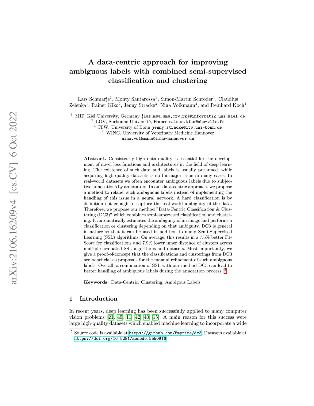 Consistently high data quality is essential for the development of novel loss functions and architectures in the field of deep learning. The existence of such data and labels is usually presumed, while acquiring high-quality datasets is still a major issue in many cases. In real-world datasets we often encounter ambiguous labels due to subjective annotations by annotators. In our data-centric approach, we propose a method to relabel such ambiguous labels instead of implementing the handling of this issue in a neural network. A hard classification is by definition not enough to capture the real-world ambiguity of the data. Therefore, we propose our method "Data-Centric Classification & Clustering (DC3)" which combines semi-supervised classification and clustering. It automatically estimates the ambiguity of an image and performs a classification or clustering depending on that ambiguity. DC3 is general in nature so that it can be used in addition to many Semi-Supervised Learning (SSL) algorithms. On average, this results in a 7.6% better F1-Score for classifications and 7.9% lower inner distance of clusters across multiple evaluated SSL algorithms and datasets. Most importantly, we give a proof-of-concept that the classifications and clusterings from DC3 are beneficial as proposals for the manual refinement of such ambiguous labels. Overall, a combination of SSL with our method DC3 can lead to better handling of ambiguous labels during the annotation process.
