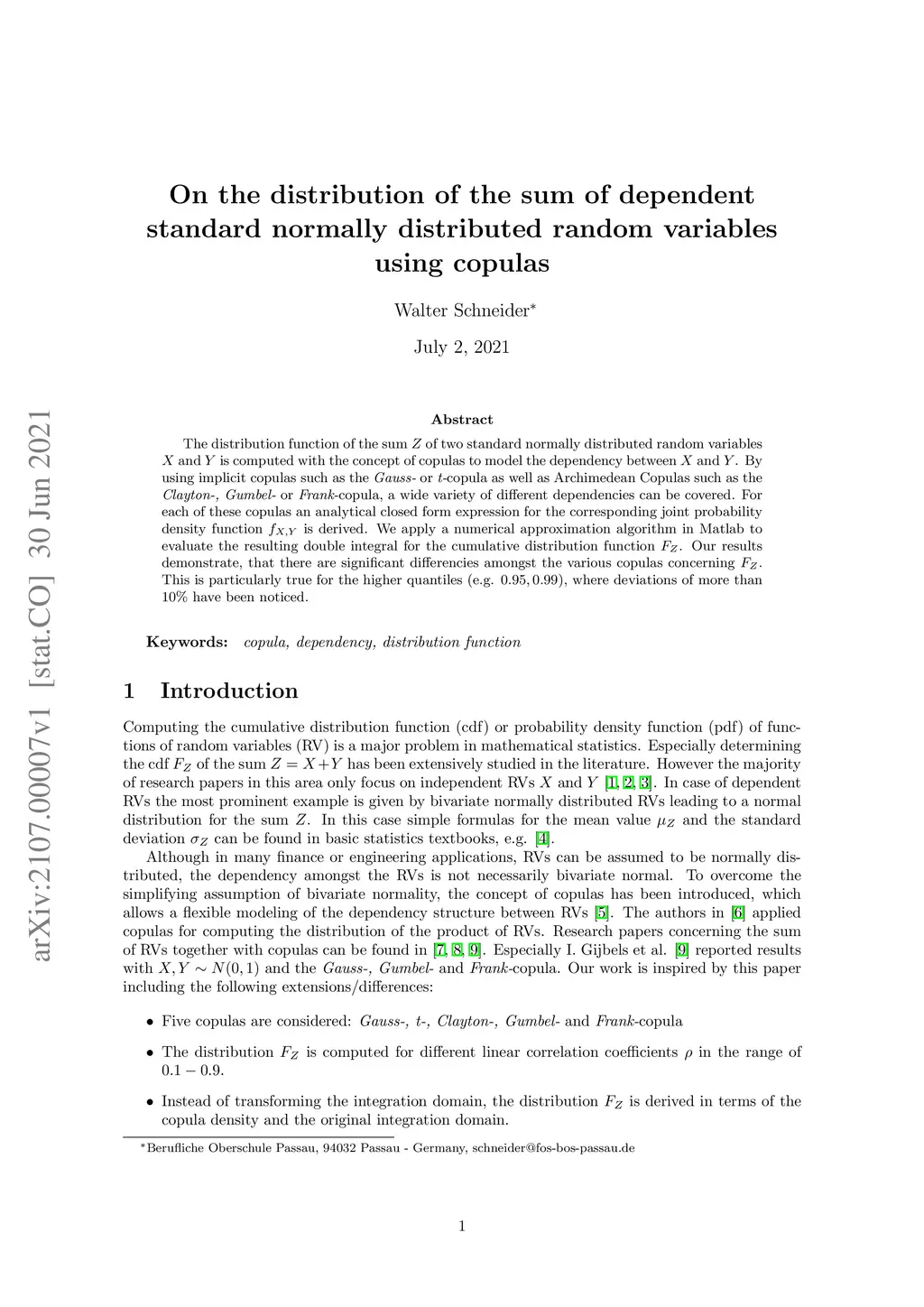 The distribution function of the sum of two standard normally distributed random variables and is computed with the concept of copulas to model the dependency between and . By using implicit copulas such as the Gauss- or t-copula as well as Archimedean Copulas such as the Clayton-, Gumbel- or Frank-copula, a wide variety of different dependencies can be covered. For each of these copulas an analytical closed form expression for the corresponding joint probability density function is derived. We apply a numerical approximation algorithm in Matlab to evaluate the resulting double integral for the cumulative distribution function . Our results demonstrate, that there are significant differencies amongst the various copulas concerning . This is particularly true for the higher quantiles (e.g. ), where deviations of more than have been noticed.