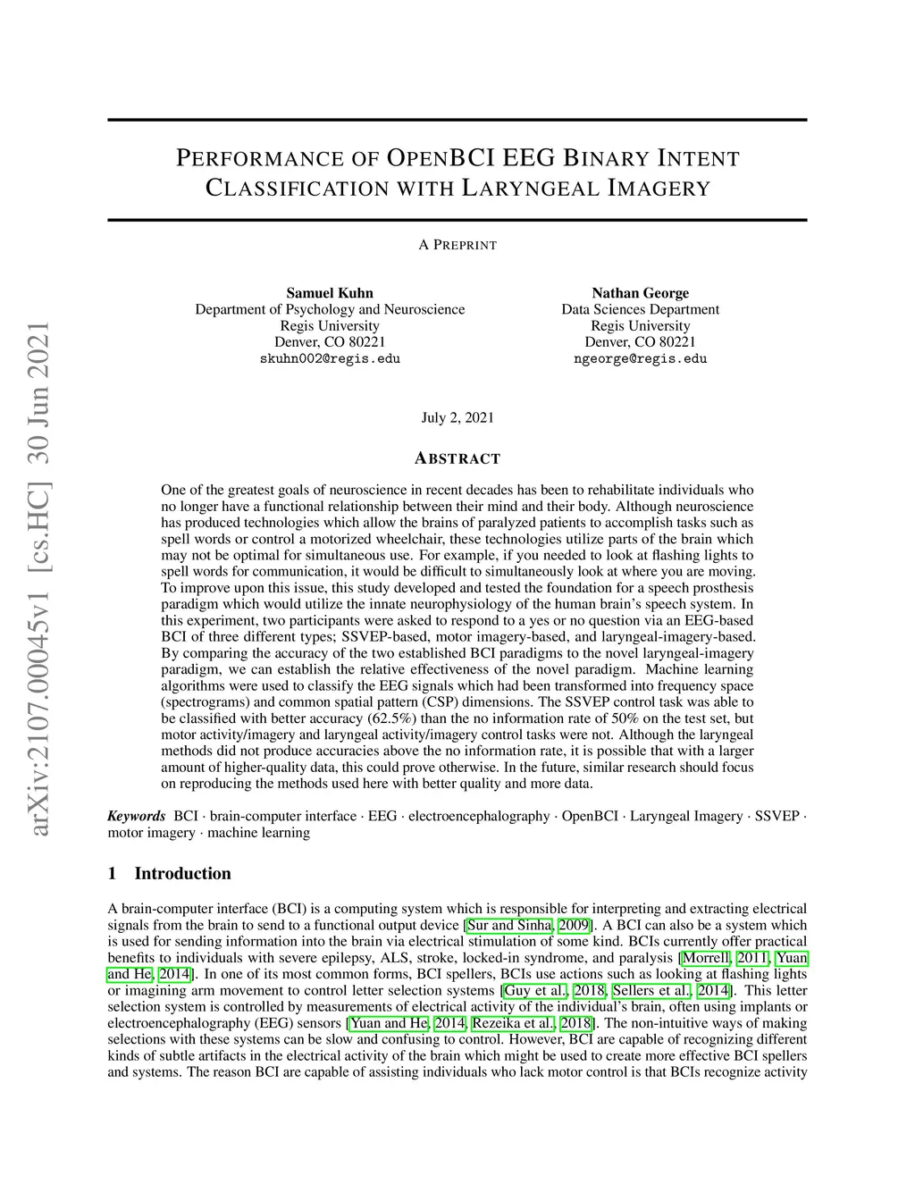 Performance of OpenBCI EEG Binary Intent Classification with Laryngeal