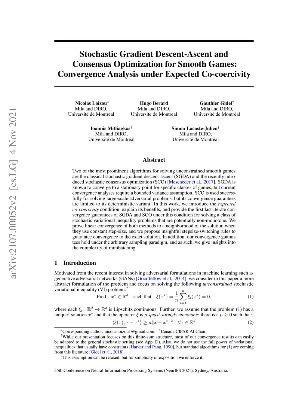 Two of the most prominent algorithms for solving unconstrained smooth games are the classical stochastic gradient descent-ascent (SGDA) and the recently introduced stochastic consensus optimization (SCO) [Mescheder et al., 2017]. SGDA is known to converge to a stationary point for specific classes of games, but current convergence analyses require a bounded variance assumption. SCO is used successfully for solving large-scale adversarial problems, but its convergence guarantees are limited to its deterministic variant. In this work, we introduce the expected co-coercivity condition, explain its benefits, and provide the first last-iterate convergence guarantees of SGDA and SCO under this condition for solving a class of stochastic variational inequality problems that are potentially non-monotone. We prove linear convergence of both methods to a neighborhood of the solution when they use constant step-size, and we propose insightful stepsize-switching rules to guarantee convergence to the exact solution. In addition, our convergence guarantees hold under the arbitrary sampling paradigm, and as such, we give insights into the complexity of minibatching.