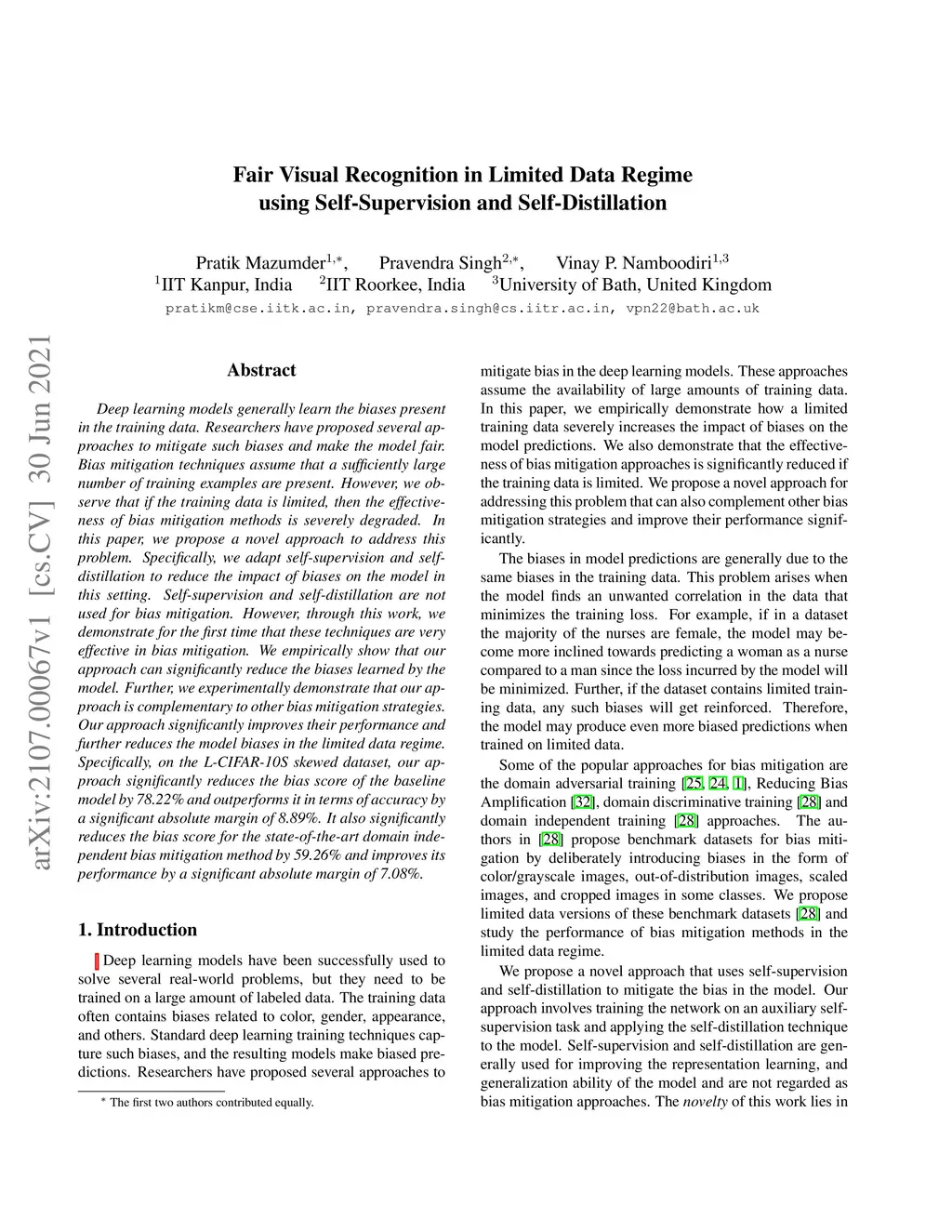 Fair Visual Recognition in Limited Data Regime using Self-Supervision