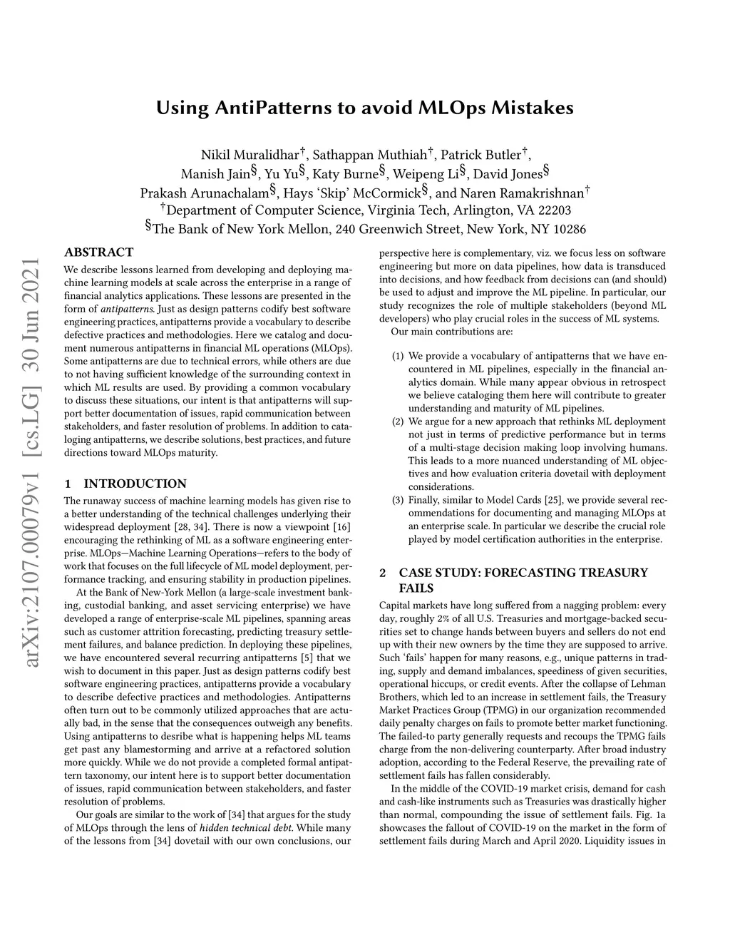 We describe lessons learned from developing and deploying machine learning models at scale across the enterprise in a range of financial analytics applications. These lessons are presented in the form of antipatterns. Just as design patterns codify best software engineering practices, antipatterns provide a vocabulary to describe defective practices and methodologies. Here we catalog and document numerous antipatterns in financial ML operations (MLOps). Some antipatterns are due to technical errors, while others are due to not having sufficient knowledge of the surrounding context in which ML results are used. By providing a common vocabulary to discuss these situations, our intent is that antipatterns will support better documentation of issues, rapid communication between stakeholders, and faster resolution of problems. In addition to cataloging antipatterns, we describe solutions, best practices, and future directions toward MLOps maturity.