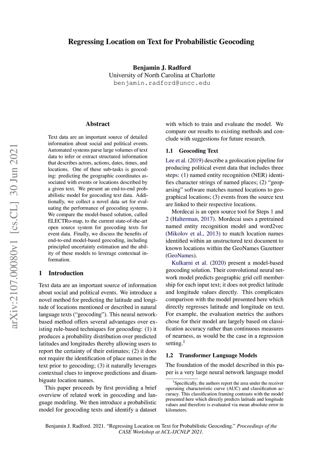 Text data are an important source of detailed information about social and political events. Automated systems parse large volumes of text data to infer or extract structured information that describes actors, actions, dates, times, and locations. One of these sub-tasks is geocoding: predicting the geographic coordinates associated with events or locations described by a given text. We present an end-to-end probabilistic model for geocoding text data. Additionally, we collect a novel data set for evaluating the performance of geocoding systems. We compare the model-based solution, called ELECTRo-map, to the current state-of-the-art open source system for geocoding texts for event data. Finally, we discuss the benefits of end-to-end model-based geocoding, including principled uncertainty estimation and the ability of these models to leverage contextual information.