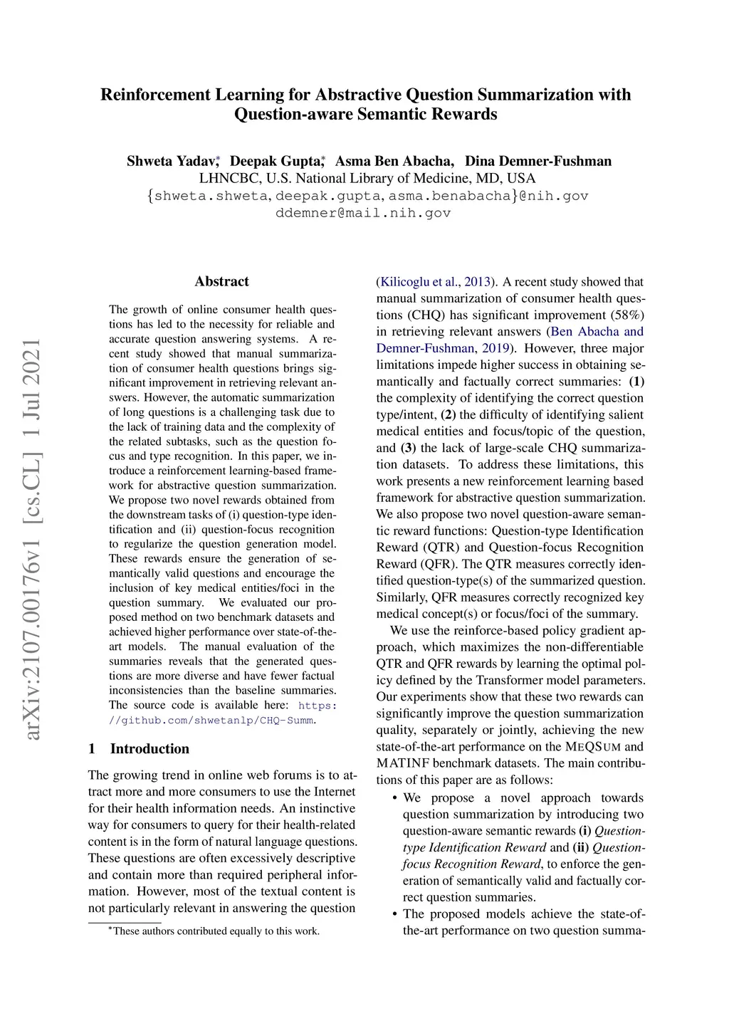 The growth of online consumer health questions has led to the necessity for reliable and accurate question answering systems. A recent study showed that manual summarization of consumer health questions brings significant improvement in retrieving relevant answers. However, the automatic summarization of long questions is a challenging task due to the lack of training data and the complexity of the related subtasks, such as the question focus and type recognition. In this paper, we introduce a reinforcement learning-based framework for abstractive question summarization. We propose two novel rewards obtained from the downstream tasks of (i) question-type identification and (ii) question-focus recognition to regularize the question generation model. These rewards ensure the generation of semantically valid questions and encourage the inclusion of key medical entities/foci in the question summary. We evaluated our proposed method on two benchmark datasets and achieved higher performance over state-of-the-art models. The manual evaluation of the summaries reveals that the generated questions are more diverse and have fewer factual inconsistencies than the baseline summaries