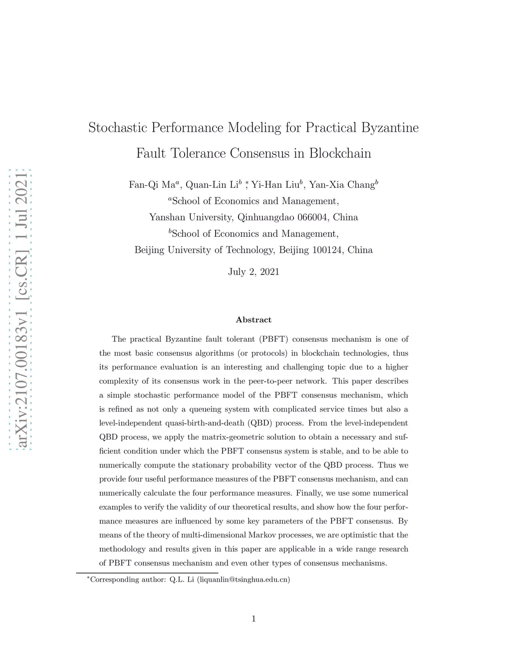 The practical Byzantine fault tolerant (PBFT) consensus mechanism is one of the most basic consensus algorithms (or protocols) in blockchain technologies, thus its performance evaluation is an interesting and challenging topic due to a higher complexity of its consensus work in the peer-to-peer network. This paper describes a simple stochastic performance model of the PBFT consensus mechanism, which is refined as not only a queueing system with complicated service times but also a level-independent quasi-birth-and-death (QBD) process. From the level-independent QBD process, we apply the matrix-geometric solution to obtain a necessary and sufficient condition under which the PBFT consensus system is stable, and to be able to numerically compute the stationary probability vector of the QBD process. Thus we provide four useful performance measures of the PBFT consensus mechanism, and can numerically calculate the four performance measures. Finally, we use some numerical examples to verify the validity of our theoretical results, and show how the four performance measures are influenced by some key parameters of the PBFT consensus. By means of the theory of multi-dimensional Markov processes, we are optimistic that the methodology and results given in this paper are applicable in a wide range research of PBFT consensus mechanism and even other types of consensus mechanisms.