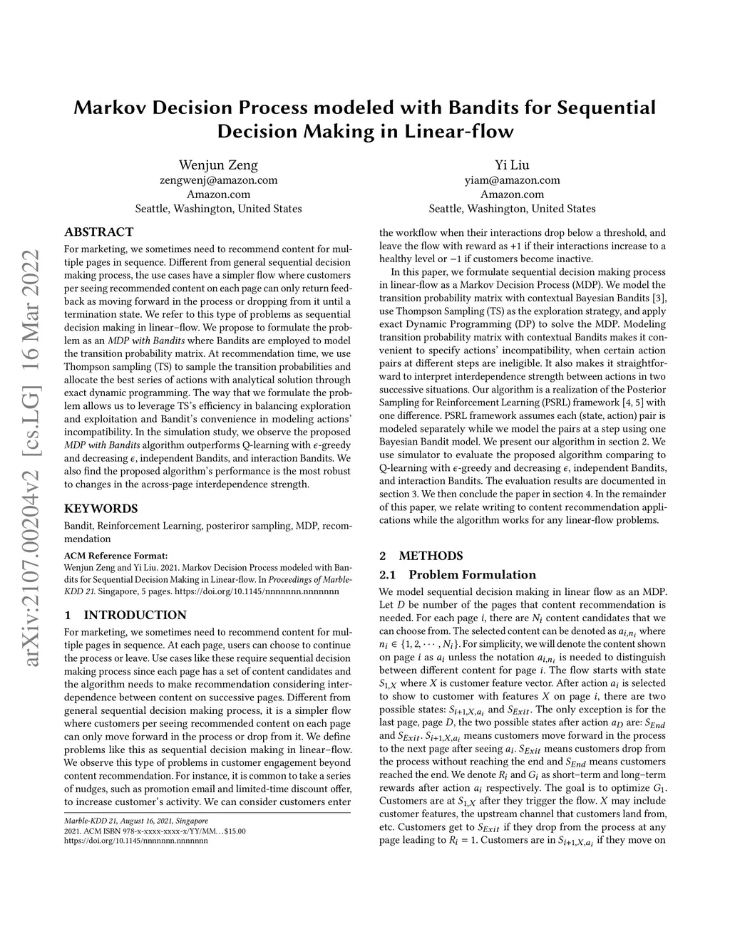 For marketing, we sometimes need to recommend content for multiple pages in sequence. Different from general sequential decision making process, the use cases have a simpler flow where customers per seeing recommended content on each page can only return feedback as moving forward in the process or dropping from it until a termination state. We refer to this type of problems as sequential decision making in linear--flow. We propose to formulate the problem as an MDP with Bandits where Bandits are employed to model the transition probability matrix. At recommendation time, we use Thompson sampling (TS) to sample the transition probabilities and allocate the best series of actions with analytical solution through exact dynamic programming. The way that we formulate the problem allows us to leverage TS's efficiency in balancing exploration and exploitation and Bandit's convenience in modeling actions' incompatibility. In the simulation study, we observe the proposed MDP with Bandits algorithm outperforms Q-learning with -greedy and decreasing , independent Bandits, and interaction Bandits. We also find the proposed algorithm's performance is the most robust to changes in the across-page interdependence strength.