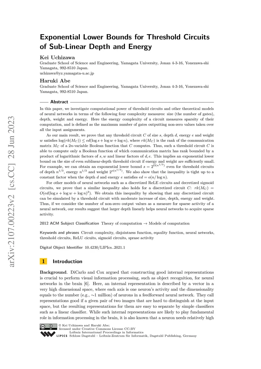 In this paper, we investigate computational power of threshold circuits and other theoretical models of neural networks in terms of the following four complexity measures: size (the number of gates), depth, weight and energy. Here the energy complexity of a circuit measures sparsity of their computation, and is defined as the maximum number of gates outputting non-zero values taken over all the input assignments. As our main result, we prove that any threshold circuit of size , depth , energy and weight satisfies , where is the rank of the communication matrix of a -variable Boolean function that computes. Thus, such a threshold circuit is able to compute only a Boolean function of which communication matrix has rank bounded by a product of logarithmic factors of and linear factors of . This implies an exponential lower bound on the size of even sublinear-depth threshold circuit if energy and weight are sufficiently small. For other models of neural networks such as a discretized ReLE circuits and decretized sigmoid circuits, we prove that a similar inequality also holds for a discretized circuit : .