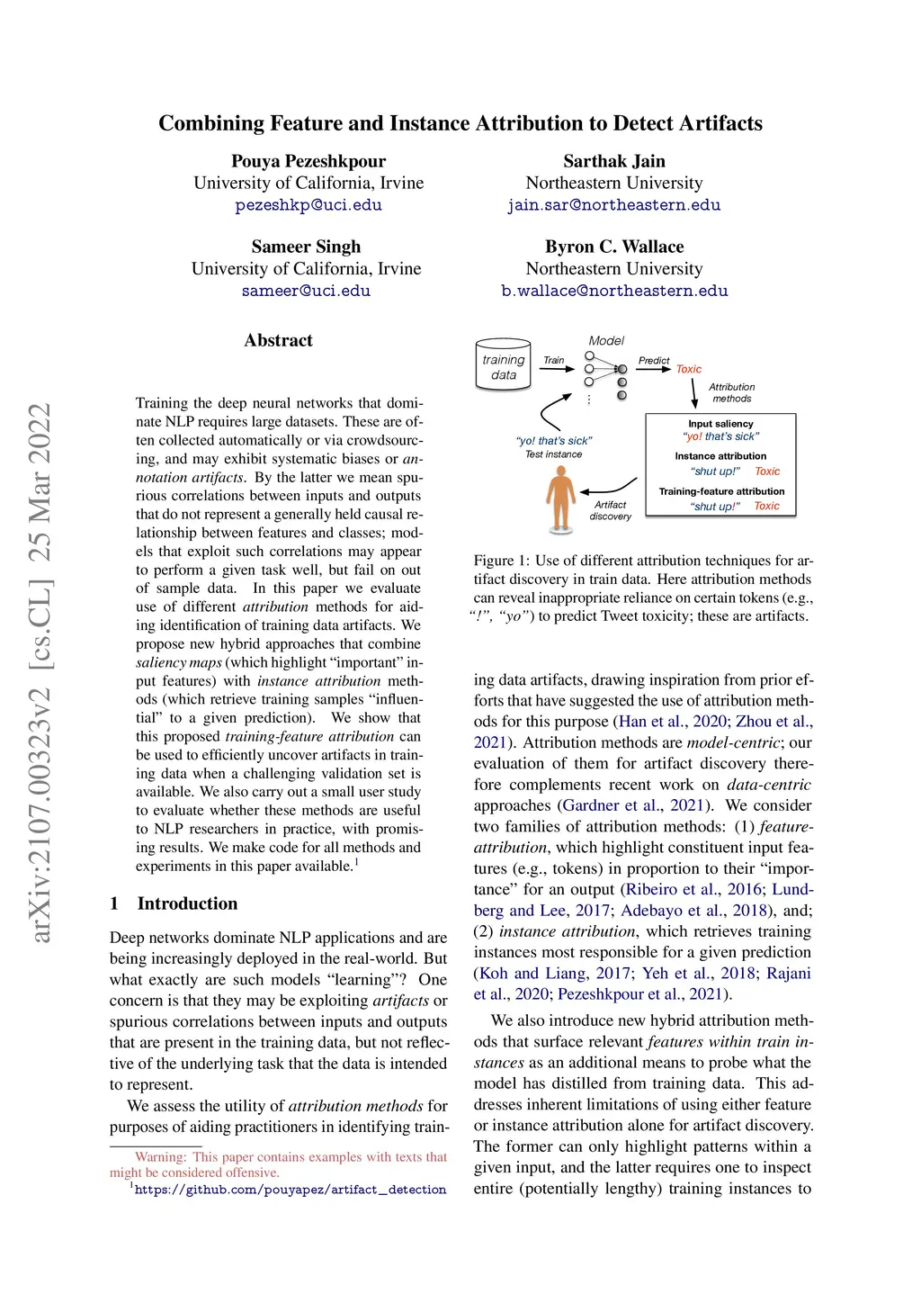 Training the deep neural networks that dominate NLP requires large datasets. These are often collected automatically or via crowdsourcing, and may exhibit systematic biases or annotation artifacts. By the latter we mean spurious correlations between inputs and outputs that do not represent a generally held causal relationship between features and classes; models that exploit such correlations may appear to perform a given task well, but fail on out of sample data. In this paper we evaluate use of different attribution methods for aiding identification of training data artifacts. We propose new hybrid approaches that combine saliency maps (which highlight important input features) with instance attribution methods (which retrieve training samples influential to a given prediction). We show that this proposed training-feature attribution can be used to efficiently uncover artifacts in training data when a challenging validation set is available. We also carry out a small user study to evaluate whether these methods are useful to NLP researchers in practice, with promising results. We make code for all methods and experiments in this paper available.