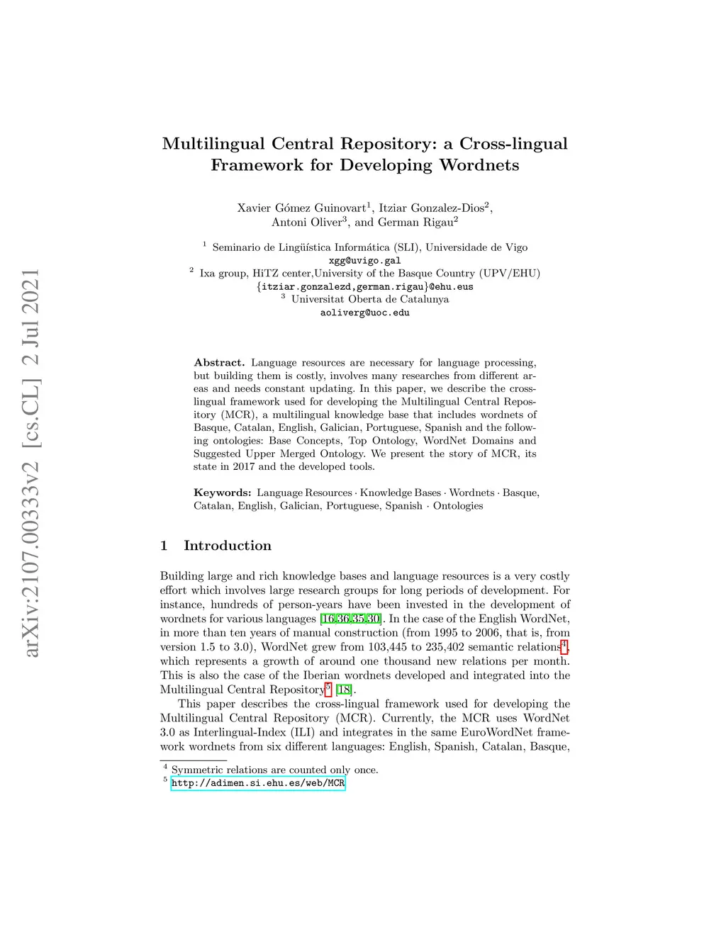 Language resources are necessary for language processing,but building them is costly, involves many researches from different areas and needs constant updating. In this paper, we describe the crosslingual framework used for developing the Multilingual Central Repository (MCR), a multilingual knowledge base that includes wordnets of Basque, Catalan, English, Galician, Portuguese, Spanish and the following ontologies: Base Concepts, Top Ontology, WordNet Domains and Suggested Upper Merged Ontology. We present the story of MCR, its state in 2017 and the developed tools.