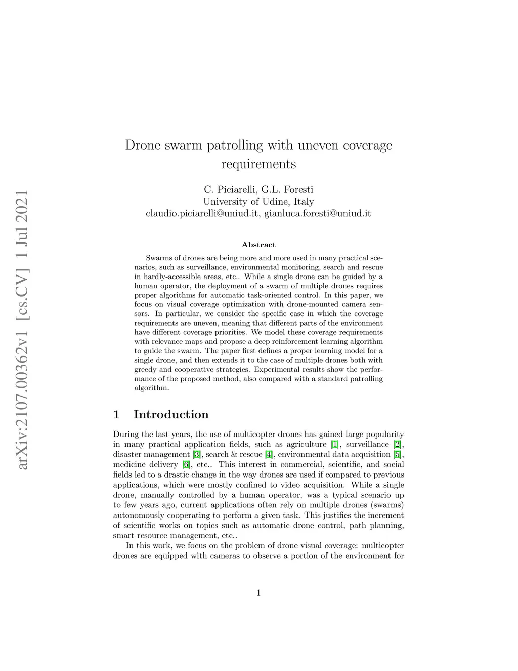 Drone swarm patrolling with uneven coverage requirements