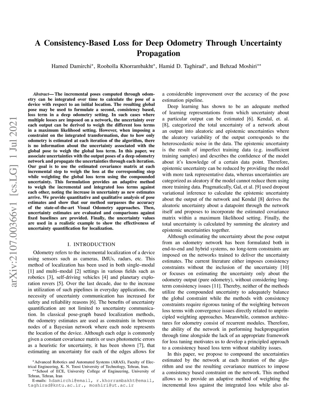 The incremental poses computed through odometry can be integrated over time to calculate the pose of a device with respect to an initial location. The resulting global pose may be used to formulate a second, consistency based, loss term in a deep odometry setting. In such cases where multiple losses are imposed on a network, the uncertainty over each output can be derived to weigh the different loss terms in a maximum likelihood setting. However, when imposing a constraint on the integrated transformation, due to how only odometry is estimated at each iteration of the algorithm, there is no information about the uncertainty associated with the global pose to weigh the global loss term. In this paper, we associate uncertainties with the output poses of a deep odometry network and propagate the uncertainties through each iteration. Our goal is to use the estimated covariance matrix at each incremental step to weigh the loss at the corresponding step while weighting the global loss term using the compounded uncertainty. This formulation provides an adaptive method to weigh the incremental and integrated loss terms against each other, noting the increase in uncertainty as new estimates arrive. We provide quantitative and qualitative analysis of pose estimates and show that our method surpasses the accuracy of the state-of-the-art Visual Odometry approaches. Then, uncertainty estimates are evaluated and comparisons against fixed baselines are provided. Finally, the uncertainty values are used in a realistic example to show the effectiveness of uncertainty quantification for localization.