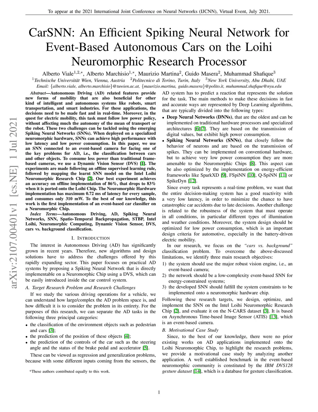 Autonomous Driving (AD) related features provide new forms of mobility that are also beneficial for other kind of intelligent and autonomous systems like robots, smart transportation, and smart industries. For these applications, the decisions need to be made fast and in real-time. Moreover, in the quest for electric mobility, this task must follow low power policy, without affecting much the autonomy of the mean of transport or the robot. These two challenges can be tackled using the emerging Spiking Neural Networks (SNNs). When deployed on a specialized neuromorphic hardware, SNNs can achieve high performance with low latency and low power consumption. In this paper, we use an SNN connected to an event-based camera for facing one of the key problems for AD, i.e., the classification between cars and other objects. To consume less power than traditional frame-based cameras, we use a Dynamic Vision Sensor (DVS). The experiments are made following an offline supervised learning rule, followed by mapping the learnt SNN model on the Intel Loihi Neuromorphic Research Chip. Our best experiment achieves an accuracy on offline implementation of 86%, that drops to 83% when it is ported onto the Loihi Chip. The Neuromorphic Hardware implementation has maximum 0.72 ms of latency for every sample, and consumes only 310 mW. To the best of our knowledge, this work is the first implementation of an event-based car classifier on a Neuromorphic Chip.