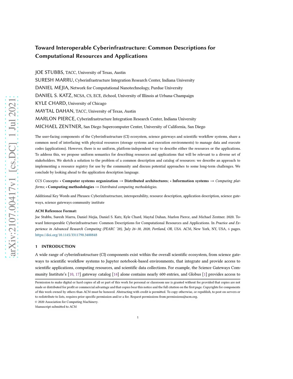 The user-facing components of the Cyberinfrastructure (CI) ecosystem, science gateways and scientific workflow systems, share a common need of interfacing with physical resources (storage systems and execution environments) to manage data and execute codes (applications). However, there is no uniform, platform-independent way to describe either the resources or the applications. To address this, we propose uniform semantics for describing resources and applications that will be relevant to a diverse set of stakeholders. We sketch a solution to the problem of a common description and catalog of resources: we describe an approach to implementing a resource registry for use by the community and discuss potential approaches to some long-term challenges. We conclude by looking ahead to the application description language.