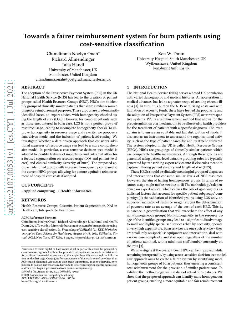 The adoption of the Prospective Payment System (PPS) in the UK National Health Service (NHS) has led to the creation of patient groups called Health Resource Groups (HRG). HRGs aim to identify groups of clinically similar patients that share similar resource usage for reimbursement purposes. These groups are predominantly identified based on expert advice, with homogeneity checked using the length of stay (LOS). However, for complex patients such as those encountered in burn care, LOS is not a perfect proxy of resource usage, leading to incomplete homogeneity checks. To improve homogeneity in resource usage and severity, we propose a data-driven model and the inclusion of patient-level costing. We investigate whether a data-driven approach that considers additional measures of resource usage can lead to a more comprehensive model. In particular, a cost-sensitive decision tree model is adopted to identify features of importance and rules that allow for a focused segmentation on resource usage (LOS and patient-level cost) and clinical similarity (severity of burn). The proposed approach identified groups with increased homogeneity compared to the current HRG groups, allowing for a more equitable reimbursement of hospital care costs if adopted.