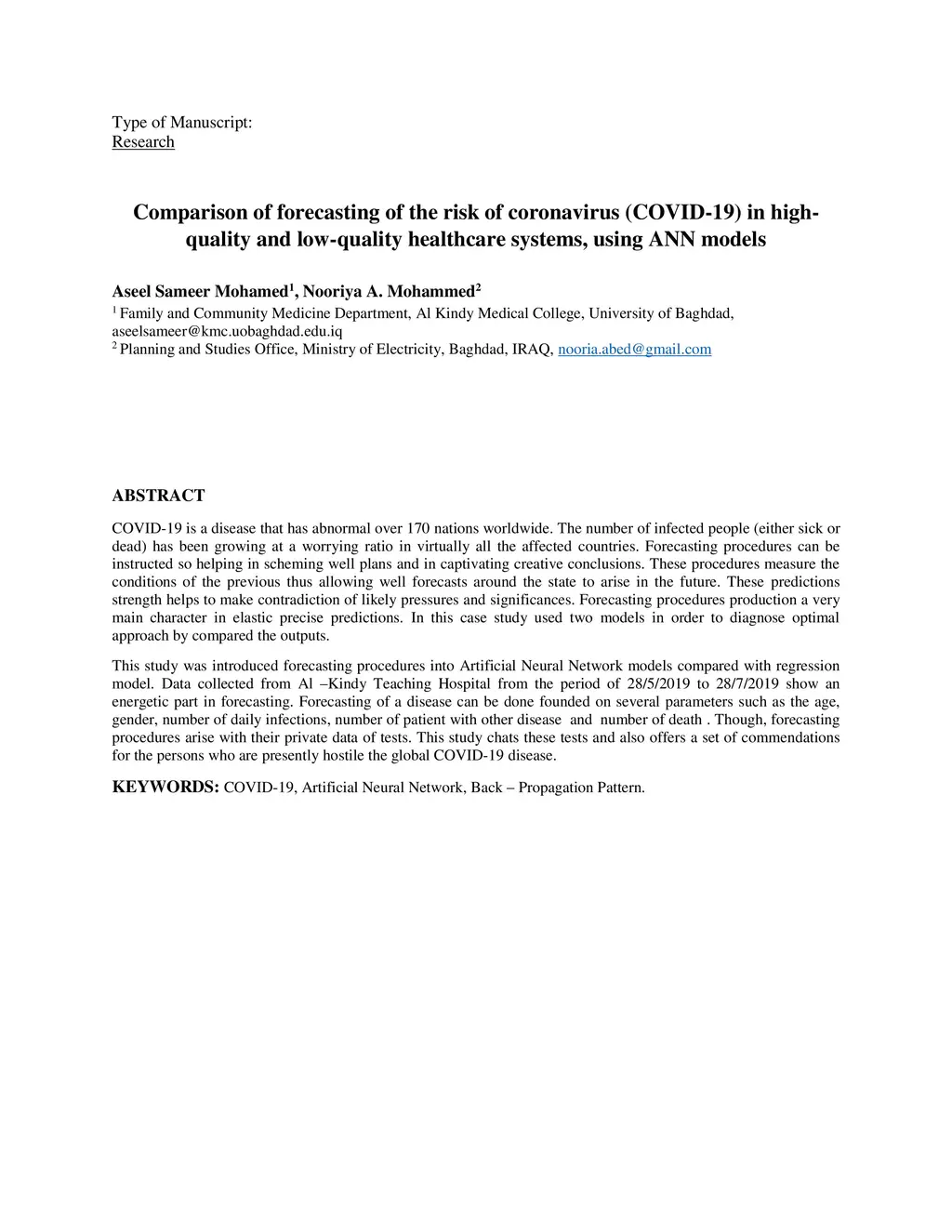 COVID 19 is a disease that has abnormal over 170 nations worldwide. The number of infected people (either sick or dead) has been growing at a worrying ratio in virtually all the affected countries. Forecasting procedures can be instructed so helping in scheming well plans and in captivating creative conclusions. These procedures measure the conditions of the previous thus allowing well forecasts around the state to arise in the future. These predictions strength helps to make contradiction of likely pressures and significances. Forecasting procedures production a very main character in elastic precise predictions. In this case study used two models in order to diagnose optimal approach by compared the outputs. This study was introduced forecasting procedures into Artificial Neural Network models compared with regression model. Data collected from Al Kindy Teaching Hospital from the period of 28/5/2019 to 28/7/2019 show an energetic part in forecasting. Forecasting of a disease can be done founded on several parameters such as the age, gender, number of daily infections, number of patient with other disease and number of death. Though, forecasting procedures arise with their private data of tests. This study chats these tests and also offers a set of commendations for the persons who are presently hostile the global COVID 19 disease.