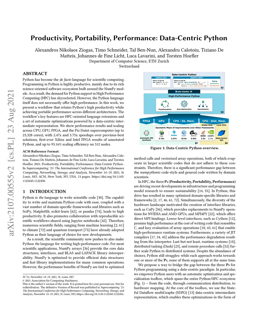Python has become the de facto language for scientific computing. Programming in Python is highly productive, mainly due to its rich science-oriented software ecosystem built around the NumPy module. As a result, the demand for Python support in High Performance Computing (HPC) has skyrocketed. However, the Python language itself does not necessarily offer high performance. In this work, we present a workflow that retains Python's high productivity while achieving portable performance across different architectures. The workflow's key features are HPC-oriented language extensions and a set of automatic optimizations powered by a data-centric intermediate representation. We show performance results and scaling across CPU, GPU, FPGA, and the Piz Daint supercomputer (up to 23,328 cores), with 2.47x and 3.75x speedups over previous-best solutions, first-ever Xilinx and Intel FPGA results of annotated Python, and up to 93.16% scaling efficiency on 512 nodes.