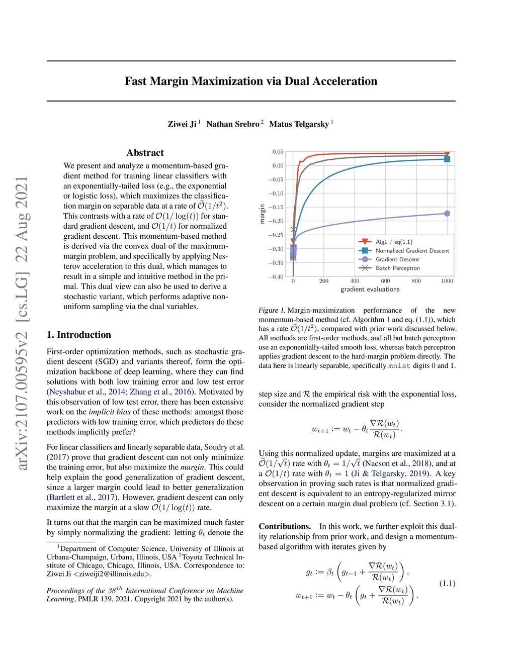 We present and analyze a momentum-based gradient method for training linear classifiers with an exponentially-tailed loss (e.g., the exponential or logistic loss), which maximizes the classification margin on separable data at a rate of . This contrasts with a rate of for standard gradient descent, and for normalized gradient descent. This momentum-based method is derived via the convex dual of the maximum-margin problem, and specifically by applying Nesterov acceleration to this dual, which manages to result in a simple and intuitive method in the primal. This dual view can also be used to derive a stochastic variant, which performs adaptive non-uniform sampling via the dual variables.