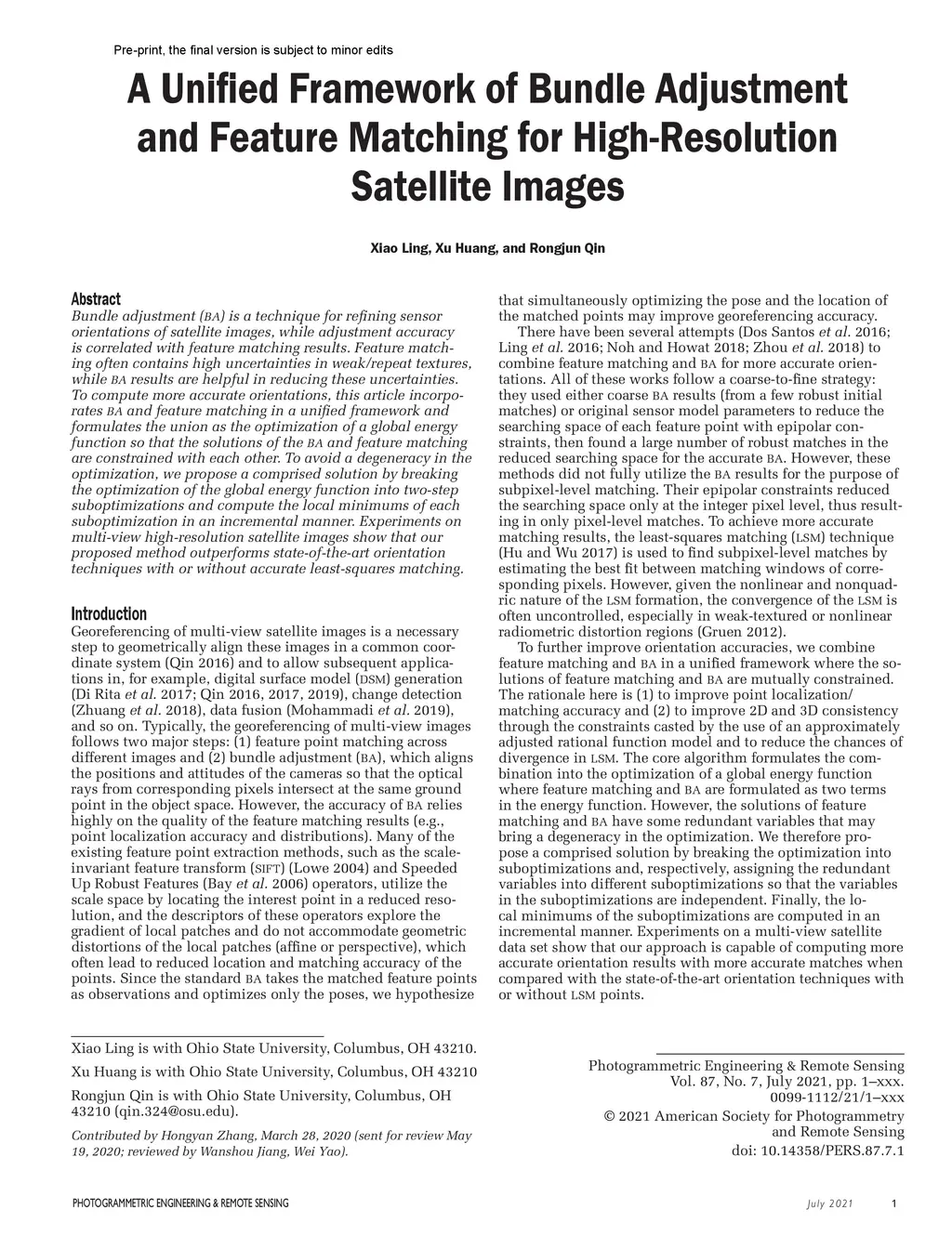 Bundle adjustment (BA) is a technique for refining sensor orientations of satellite images, while adjustment accuracy is correlated with feature matching results. Feature match-ing often contains high uncertainties in weak/repeat textures, while BA results are helpful in reducing these uncertainties. To compute more accurate orientations, this article incorpo-rates BA and feature matching in a unified framework and formulates the union as the optimization of a global energy function so that the solutions of the BA and feature matching are constrained with each other. To avoid a degeneracy in the optimization, we propose a comprised solution by breaking the optimization of the global energy function into two-step suboptimizations and compute the local minimums of each suboptimization in an incremental manner. Experiments on multi-view high-resolution satellite images show that our proposed method outperforms state-of-the-art orientation techniques with or without accurate least-squares matching.