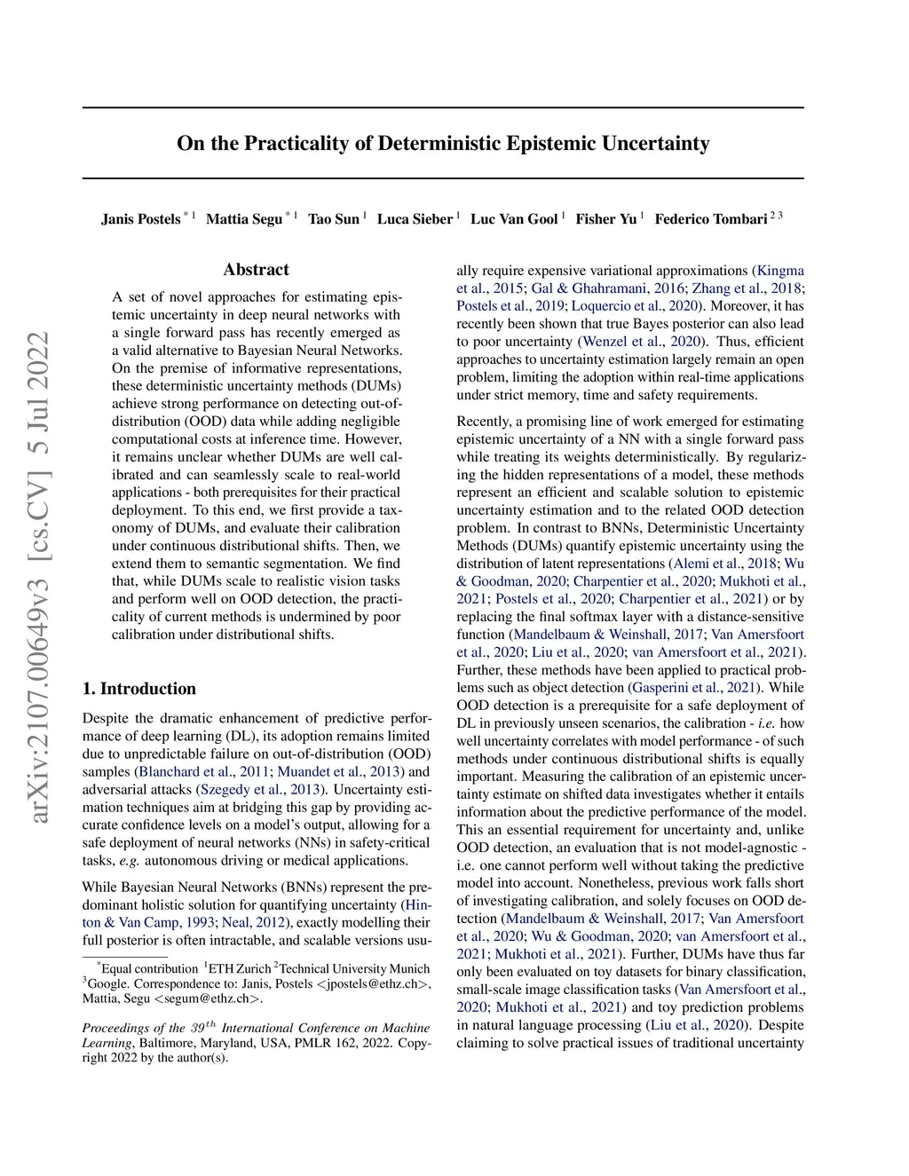 A set of novel approaches for estimating epistemic uncertainty in deep neural networks with a single forward pass has recently emerged as a valid alternative to Bayesian Neural Networks. On the premise of informative representations, these deterministic uncertainty methods (DUMs) achieve strong performance on detecting out-of-distribution (OOD) data while adding negligible computational costs at inference time. However, it remains unclear whether DUMs are well calibrated and can seamlessly scale to real-world applications - both prerequisites for their practical deployment. To this end, we first provide a taxonomy of DUMs, and evaluate their calibration under continuous distributional shifts. Then, we extend them to semantic segmentation. We find that, while DUMs scale to realistic vision tasks and perform well on OOD detection, the practicality of current methods is undermined by poor calibration under distributional shifts.