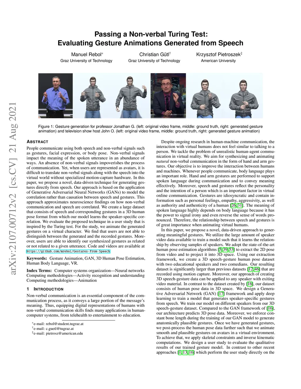 People communicate using both speech and non-verbal signals such as gestures, face expression or body pose. Non-verbal signals impact the meaning of the spoken utterance in an abundance of ways. An absence of non-verbal signals impoverishes the process of communication. Yet, when users are represented as avatars, it is difficult to translate non-verbal signals along with the speech into the virtual world without specialized motion-capture hardware. In this paper, we propose a novel, data-driven technique for generating gestures directly from speech. Our approach is based on the application of Generative Adversarial Neural Networks (GANs) to model the correlation rather than causation between speech and gestures. This approach approximates neuroscience findings on how non-verbal communication and speech are correlated. We create a large dataset which consists of speech and corresponding gestures in a 3D human pose format from which our model learns the speaker-specific correlation. We evaluate the proposed technique in a user study that is inspired by the Turing test. For the study, we animate the generated gestures on a virtual character. We find that users are not able to distinguish between the generated and the recorded gestures. Moreover, users are able to identify our synthesized gestures as related or not related to a given utterance. Code and videos are available at https://github.com/mrebol/Gestures-From-Speech