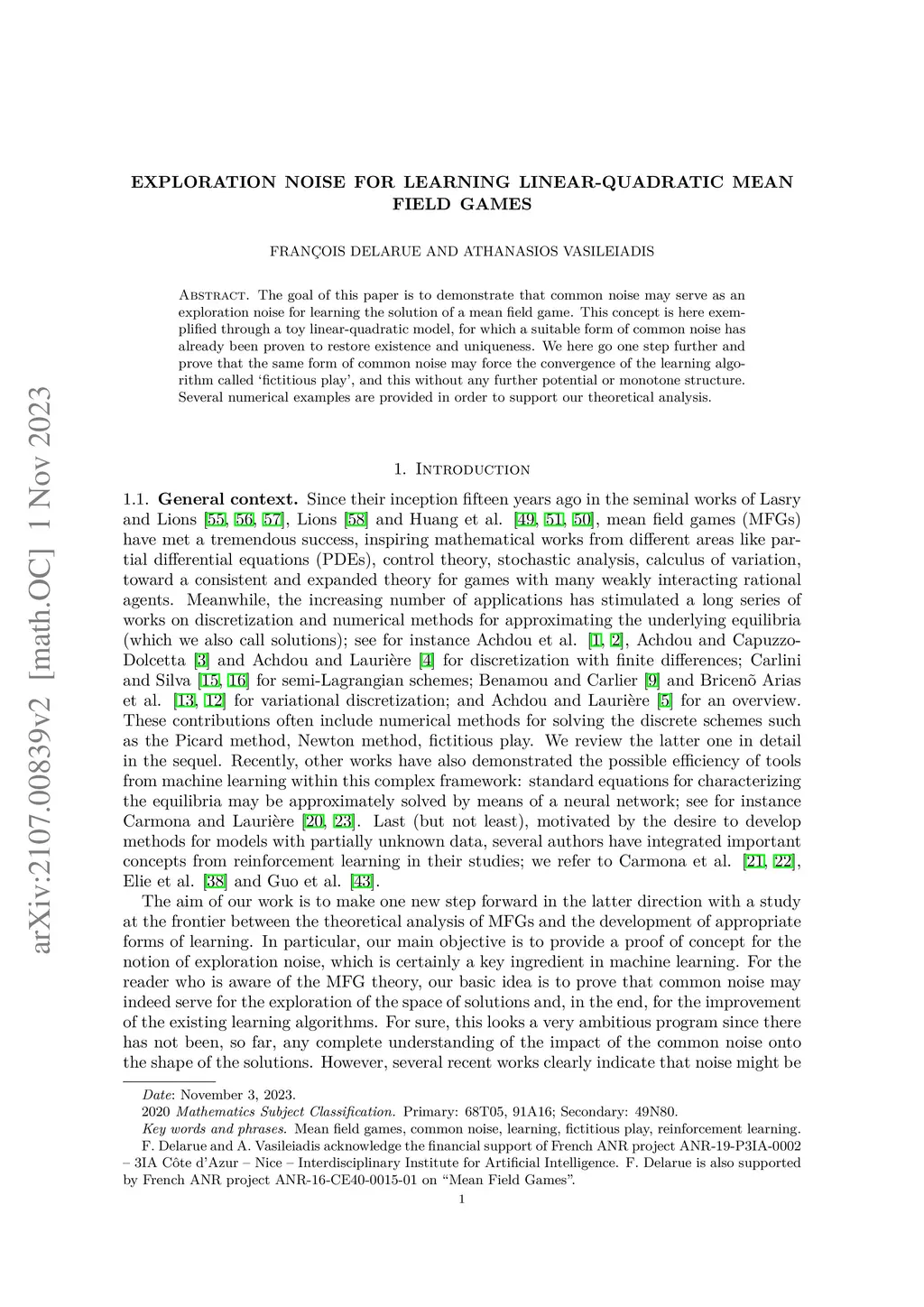 The goal of this paper is to demonstrate that common noise may serve as an exploration noise for learning the solution of a mean field game. This concept is here exemplified through a toy linear-quadratic model, for which a suitable form of common noise has already been proven to restore existence and uniqueness. We here go one step further and prove that the same form of common noise may force the convergence of the learning algorithm called `fictitious play', and this without any further potential or monotone structure. Several numerical examples are provided in order to support our theoretical analysis.