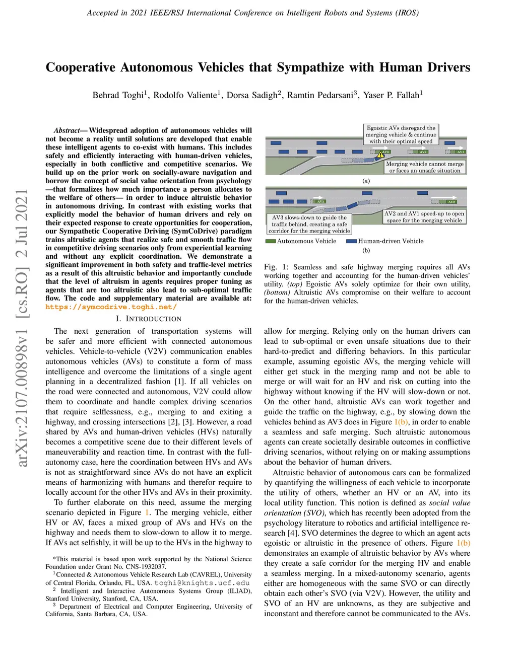 Widespread adoption of autonomous vehicles will not become a reality until solutions are developed that enable these intelligent agents to co-exist with humans. This includes safely and efficiently interacting with human-driven vehicles, especially in both conflictive and competitive scenarios. We build up on the prior work on socially-aware navigation and borrow the concept of social value orientation from psychology -- that formalizes how much importance a person allocates to the welfare of others -- in order to induce altruistic behavior in autonomous driving. In contrast with existing works that explicitly model the behavior of human drivers and rely on their expected response to create opportunities for cooperation, our Sympathetic Cooperative Driving (SymCoDrive) paradigm trains altruistic agents that realize safe and smooth traffic flow in competitive driving scenarios only from experiential learning and without any explicit coordination. We demonstrate a significant improvement in both safety and traffic-level metrics as a result of this altruistic behavior and importantly conclude that the level of altruism in agents requires proper tuning as agents that are too altruistic also lead to sub-optimal traffic flow. The code and supplementary material are available at: https://symcodrive.toghi.net/