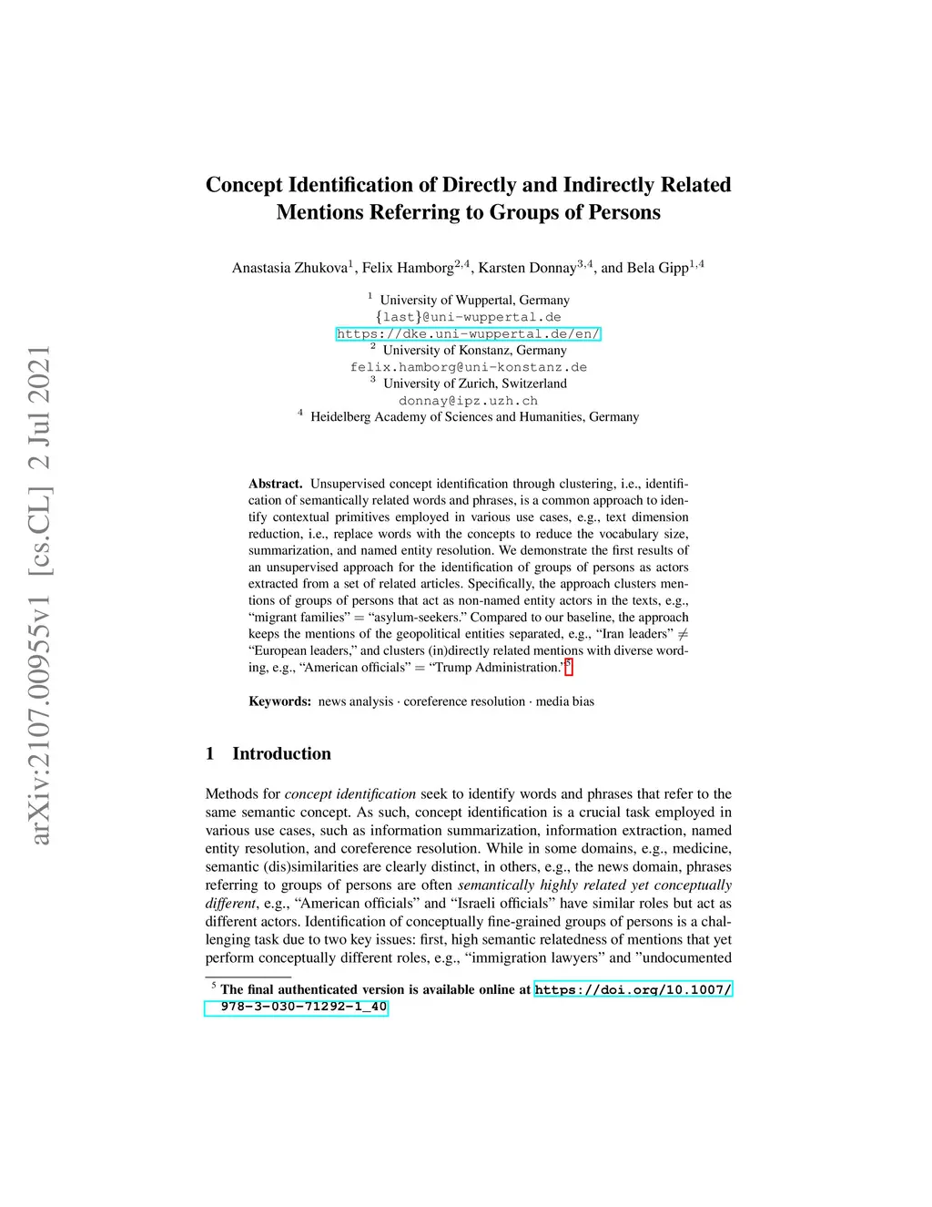 Unsupervised concept identification through clustering, i.e., identification of semantically related words and phrases, is a common approach to identify contextual primitives employed in various use cases, e.g., text dimension reduction, i.e., replace words with the concepts to reduce the vocabulary size, summarization, and named entity resolution. We demonstrate the first results of an unsupervised approach for the identification of groups of persons as actors extracted from a set of related articles. Specifically, the approach clusters mentions of groups of persons that act as non-named entity actors in the texts, e.g., "migrant families" = "asylum-seekers." Compared to our baseline, the approach keeps the mentions of the geopolitical entities separated, e.g., "Iran leaders" != "European leaders," and clusters (in)directly related mentions with diverse wording, e.g., "American officials" = "Trump Administration."