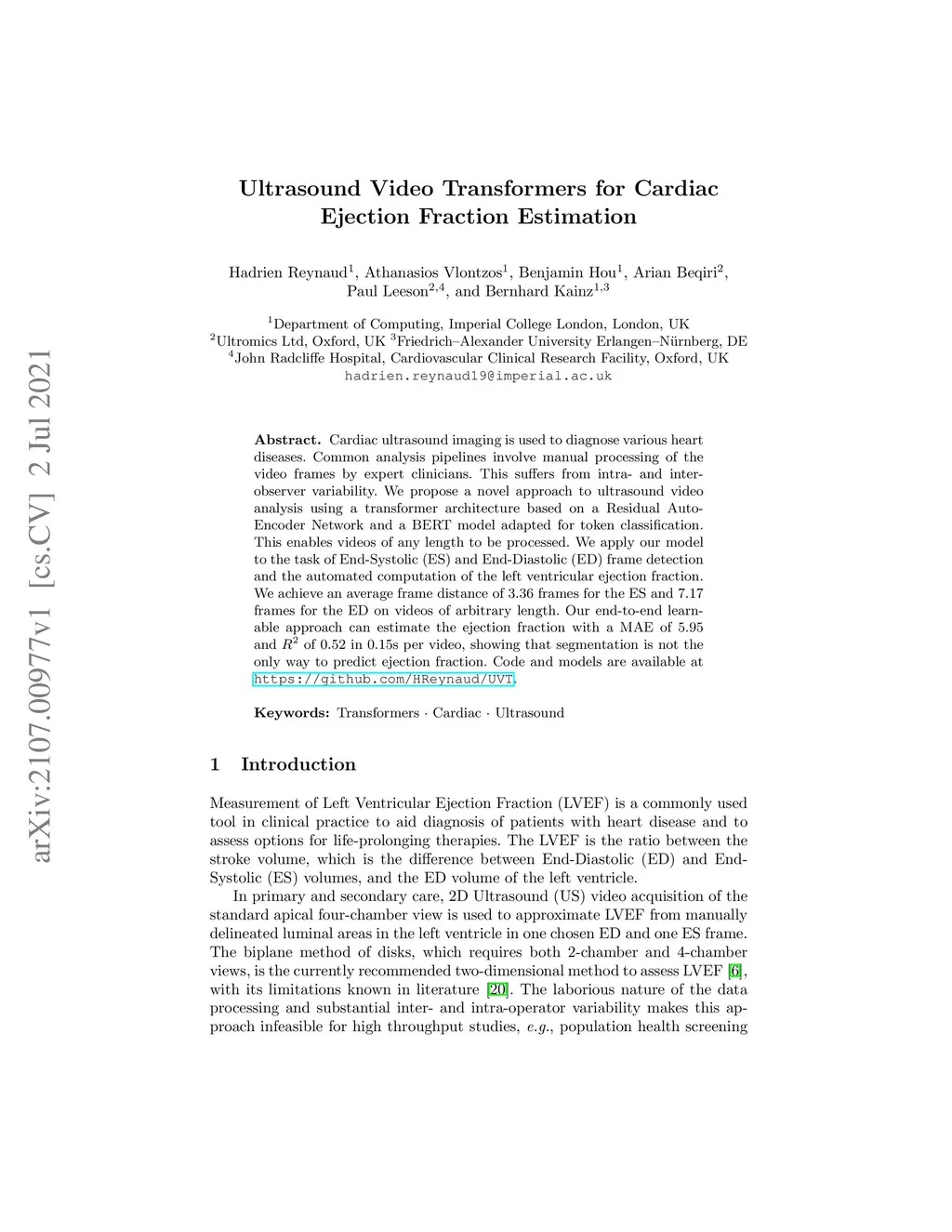 Cardiac ultrasound imaging is used to diagnose various heart diseases. Common analysis pipelines involve manual processing of the video frames by expert clinicians. This suffers from intra- and inter-observer variability. We propose a novel approach to ultrasound video analysis using a transformer architecture based on a Residual Auto-Encoder Network and a BERT model adapted for token classification. This enables videos of any length to be processed. We apply our model to the task of End-Systolic (ES) and End-Diastolic (ED) frame detection and the automated computation of the left ventricular ejection fraction. We achieve an average frame distance of 3.36 frames for the ES and 7.17 frames for the ED on videos of arbitrary length. Our end-to-end learnable approach can estimate the ejection fraction with a MAE of 5.95 and of 0.52 in 0.15s per video, showing that segmentation is not the only way to predict ejection fraction. Code and models are available at https://github.com/HReynaud/UVT.