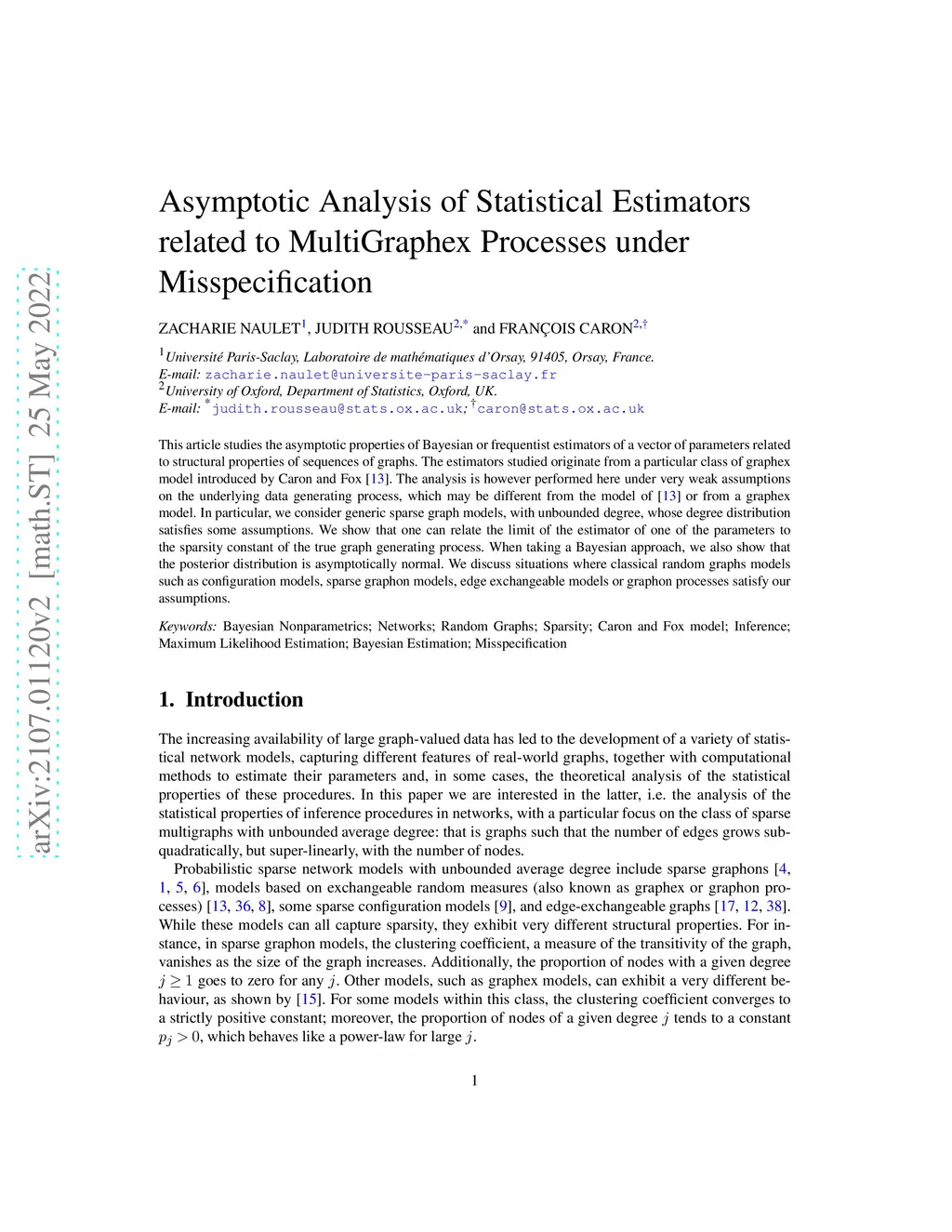 This article studies the asymptotic properties of Bayesian or frequentist estimators of a vector of parameters related to structural properties of sequences of graphs. The estimators studied originate from a particular class of graphex model introduced by Caron and Fox. The analysis is however performed here under very weak assumptions on the underlying data generating process, which may be different from the model of Caron and Fox or from a graphex model. In particular, we consider generic sparse graph models, with unbounded degree, whose degree distribution satisfies some assumptions. We show that one can relate the limit of the estimator of one of the parameters to the sparsity constant of the true graph generating process. When taking a Bayesian approach, we also show that the posterior distribution is asymptotically normal. We discuss situations where classical random graphs models such as configuration models, sparse graphon models, edge exchangeable models or graphon processes satisfy our assumptions.