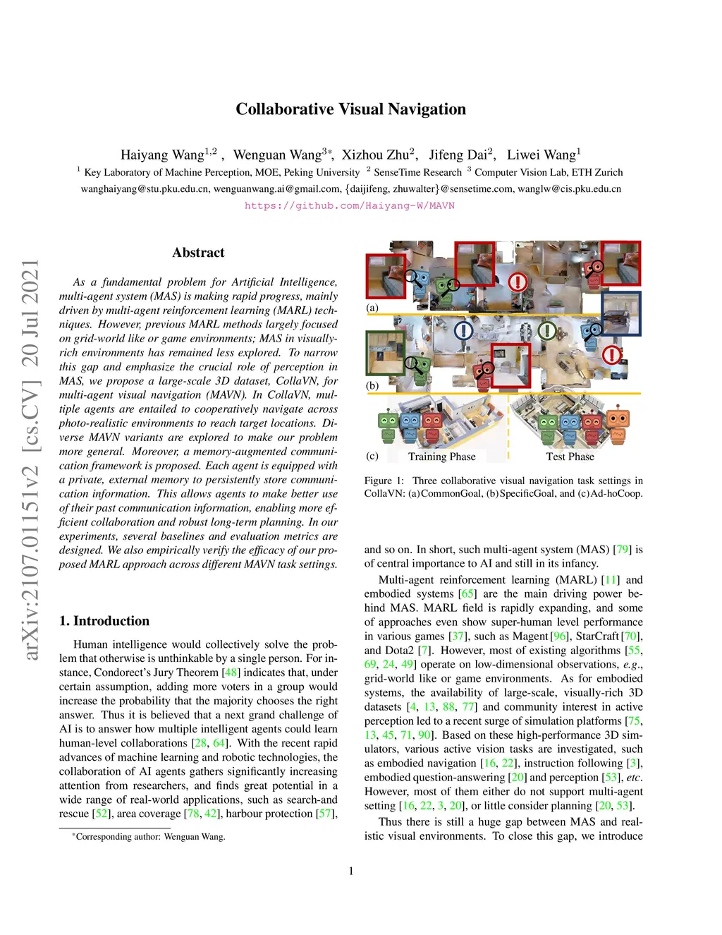 As a fundamental problem for Artificial Intelligence, multi-agent system (MAS) is making rapid progress, mainly driven by multi-agent reinforcement learning (MARL) techniques. However, previous MARL methods largely focused on grid-world like or game environments; MAS in visually rich environments has remained less explored. To narrow this gap and emphasize the crucial role of perception in MAS, we propose a large-scale 3D dataset, CollaVN, for multi-agent visual navigation (MAVN). In CollaVN, multiple agents are entailed to cooperatively navigate across photo-realistic environments to reach target locations. Diverse MAVN variants are explored to make our problem more general. Moreover, a memory-augmented communication framework is proposed. Each agent is equipped with a private, external memory to persistently store communication information. This allows agents to make better use of their past communication information, enabling more efficient collaboration and robust long-term planning. In our experiments, several baselines and evaluation metrics are designed. We also empirically verify the efficacy of our proposed MARL approach across different MAVN task settings.