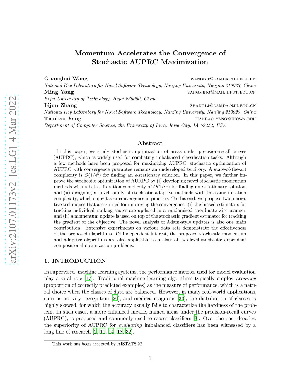In this paper, we study stochastic optimization of areas under precision-recall curves (AUPRC), which is widely used for combating imbalanced classification tasks. Although a few methods have been proposed for maximizing AUPRC, stochastic optimization of AUPRC with convergence guarantee remains an undeveloped territory. A state-of-the-art complexity is for finding an -stationary solution. In this paper, we further improve the stochastic optimization of AURPC by (i) developing novel stochastic momentum methods with a better iteration complexity of for finding an -stationary solution; and (ii) designing a novel family of stochastic adaptive methods with the same iteration complexity, which enjoy faster convergence in practice. To this end, we propose two innovative techniques that are critical for improving the convergence: (i) the biased estimators for tracking individual ranking scores are updated in a randomized coordinate-wise manner; and (ii) a momentum update is used on top of the stochastic gradient estimator for tracking the gradient of the objective. The novel analysis of Adam-style updates is also one main contribution. Extensive experiments on various data sets demonstrate the effectiveness of the proposed algorithms. Of independent interest, the proposed stochastic momentum and adaptive algorithms are also applicable to a class of two-level stochastic dependent compositional optimization problems.