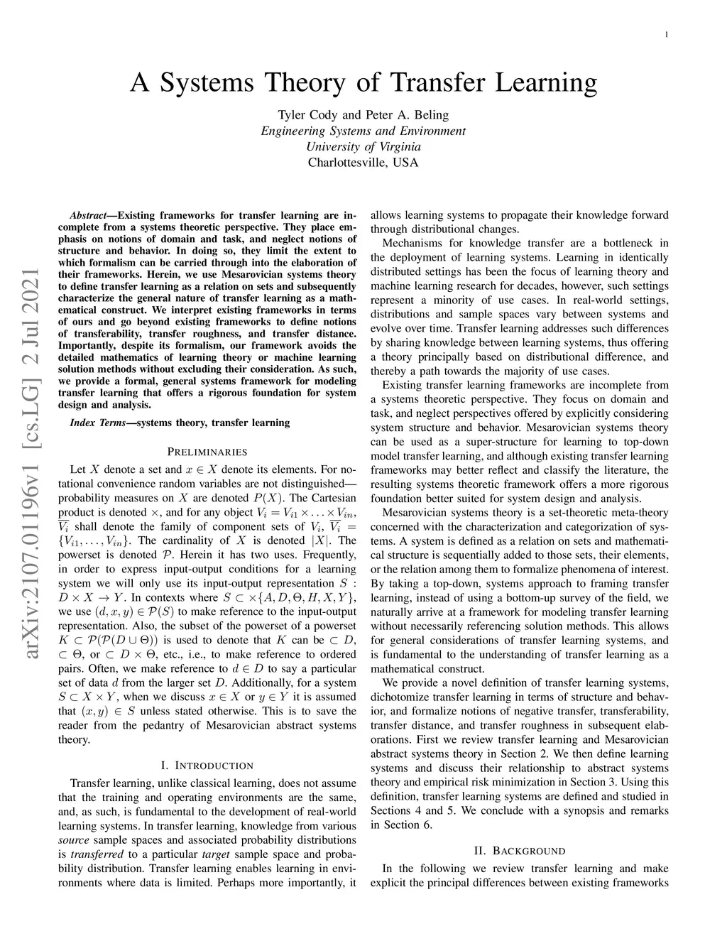 Existing frameworks for transfer learning are incomplete from a systems theoretic perspective. They place emphasis on notions of domain and task, and neglect notions of structure and behavior. In doing so, they limit the extent to which formalism can be carried through into the elaboration of their frameworks. Herein, we use Mesarovician systems theory to define transfer learning as a relation on sets and subsequently characterize the general nature of transfer learning as a mathematical construct. We interpret existing frameworks in terms of ours and go beyond existing frameworks to define notions of transferability, transfer roughness, and transfer distance. Importantly, despite its formalism, our framework avoids the detailed mathematics of learning theory or machine learning solution methods without excluding their consideration. As such, we provide a formal, general systems framework for modeling transfer learning that offers a rigorous foundation for system design and analysis.
