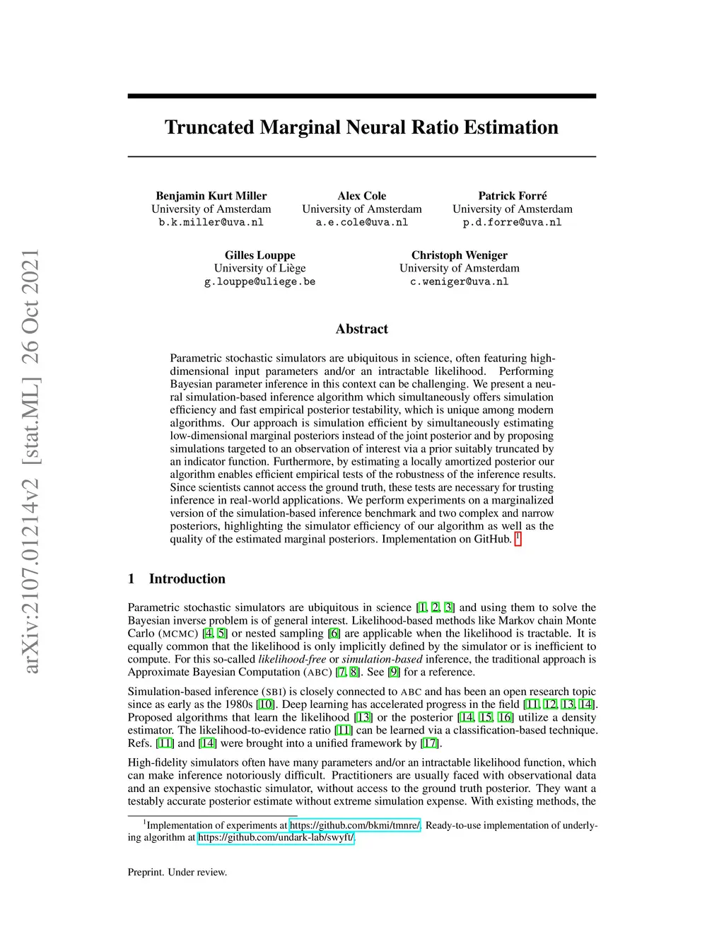 Parametric stochastic simulators are ubiquitous in science, often featuring high-dimensional input parameters and/or an intractable likelihood. Performing Bayesian parameter inference in this context can be challenging. We present a neural simulation-based inference algorithm which simultaneously offers simulation efficiency and fast empirical posterior testability, which is unique among modern algorithms. Our approach is simulation efficient by simultaneously estimating low-dimensional marginal posteriors instead of the joint posterior and by proposing simulations targeted to an observation of interest via a prior suitably truncated by an indicator function. Furthermore, by estimating a locally amortized posterior our algorithm enables efficient empirical tests of the robustness of the inference results. Since scientists cannot access the ground truth, these tests are necessary for trusting inference in real-world applications. We perform experiments on a marginalized version of the simulation-based inference benchmark and two complex and narrow posteriors, highlighting the simulator efficiency of our algorithm as well as the quality of the estimated marginal posteriors.