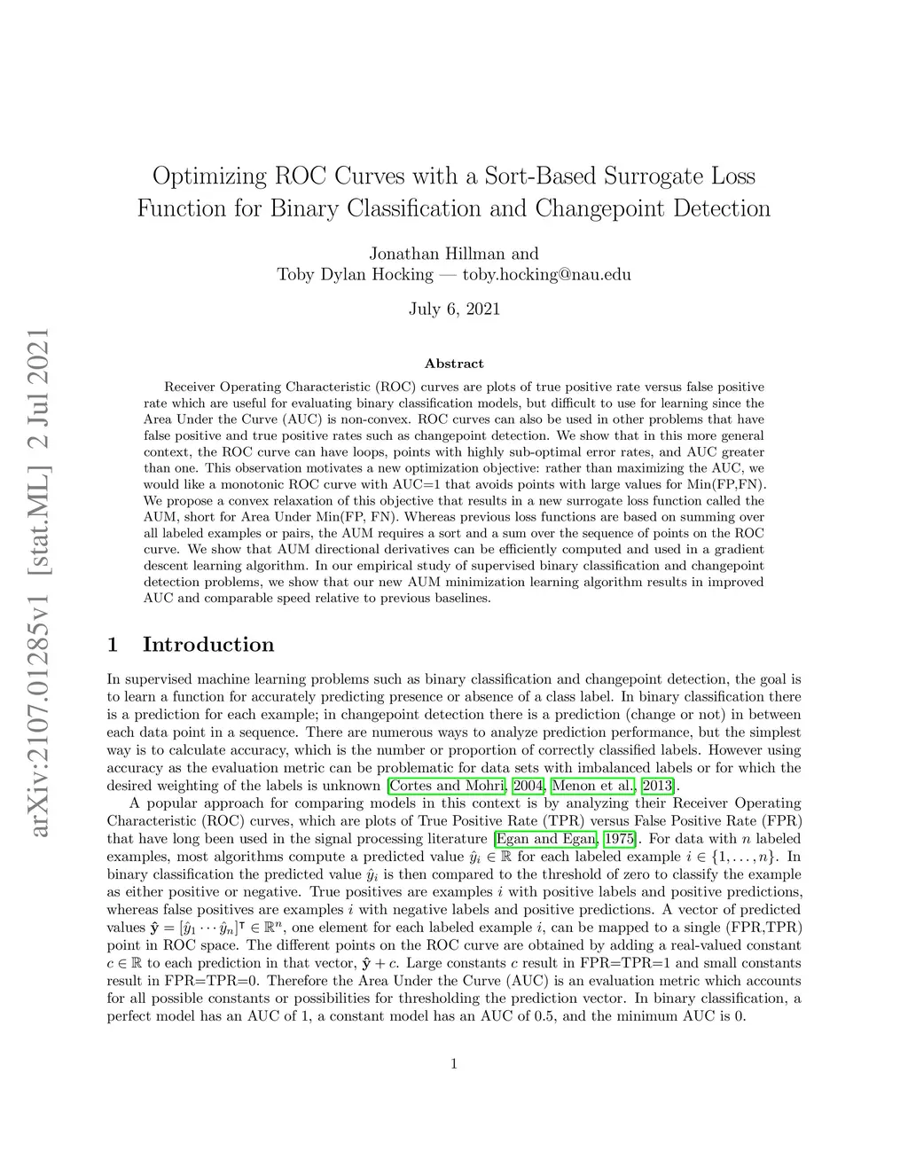 Receiver Operating Characteristic (ROC) curves are plots of true positive rate versus false positive rate which are useful for evaluating binary classification models, but difficult to use for learning since the Area Under the Curve (AUC) is non-convex. ROC curves can also be used in other problems that have false positive and true positive rates such as changepoint detection. We show that in this more general context, the ROC curve can have loops, points with highly sub-optimal error rates, and AUC greater than one. This observation motivates a new optimization objective: rather than maximizing the AUC, we would like a monotonic ROC curve with AUC=1 that avoids points with large values for Min(FP,FN). We propose a convex relaxation of this objective that results in a new surrogate loss function called the AUM, short for Area Under Min(FP, FN). Whereas previous loss functions are based on summing over all labeled examples or pairs, the AUM requires a sort and a sum over the sequence of points on the ROC curve. We show that AUM directional derivatives can be efficiently computed and used in a gradient descent learning algorithm. In our empirical study of supervised binary classification and changepoint detection problems, we show that our new AUM minimization learning algorithm results in improved AUC and comparable speed relative to previous baselines.