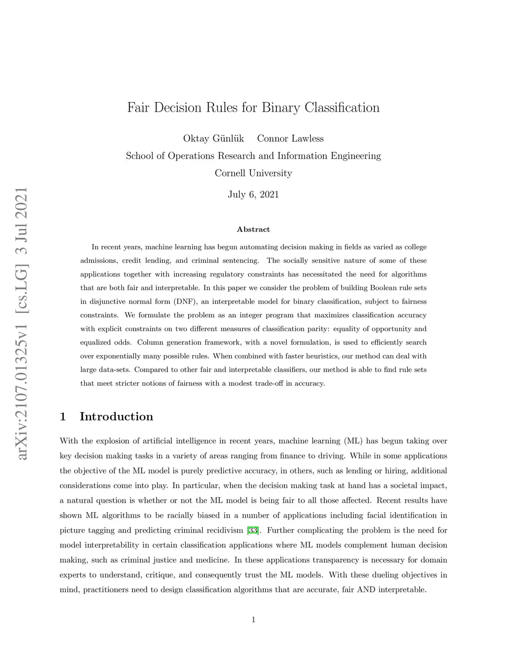 In recent years, machine learning has begun automating decision making in fields as varied as college admissions, credit lending, and criminal sentencing. The socially sensitive nature of some of these applications together with increasing regulatory constraints has necessitated the need for algorithms that are both fair and interpretable. In this paper we consider the problem of building Boolean rule sets in disjunctive normal form (DNF), an interpretable model for binary classification, subject to fairness constraints. We formulate the problem as an integer program that maximizes classification accuracy with explicit constraints on two different measures of classification parity: equality of opportunity and equalized odds. Column generation framework, with a novel formulation, is used to efficiently search over exponentially many possible rules. When combined with faster heuristics, our method can deal with large data-sets. Compared to other fair and interpretable classifiers, our method is able to find rule sets that meet stricter notions of fairness with a modest trade-off in accuracy.