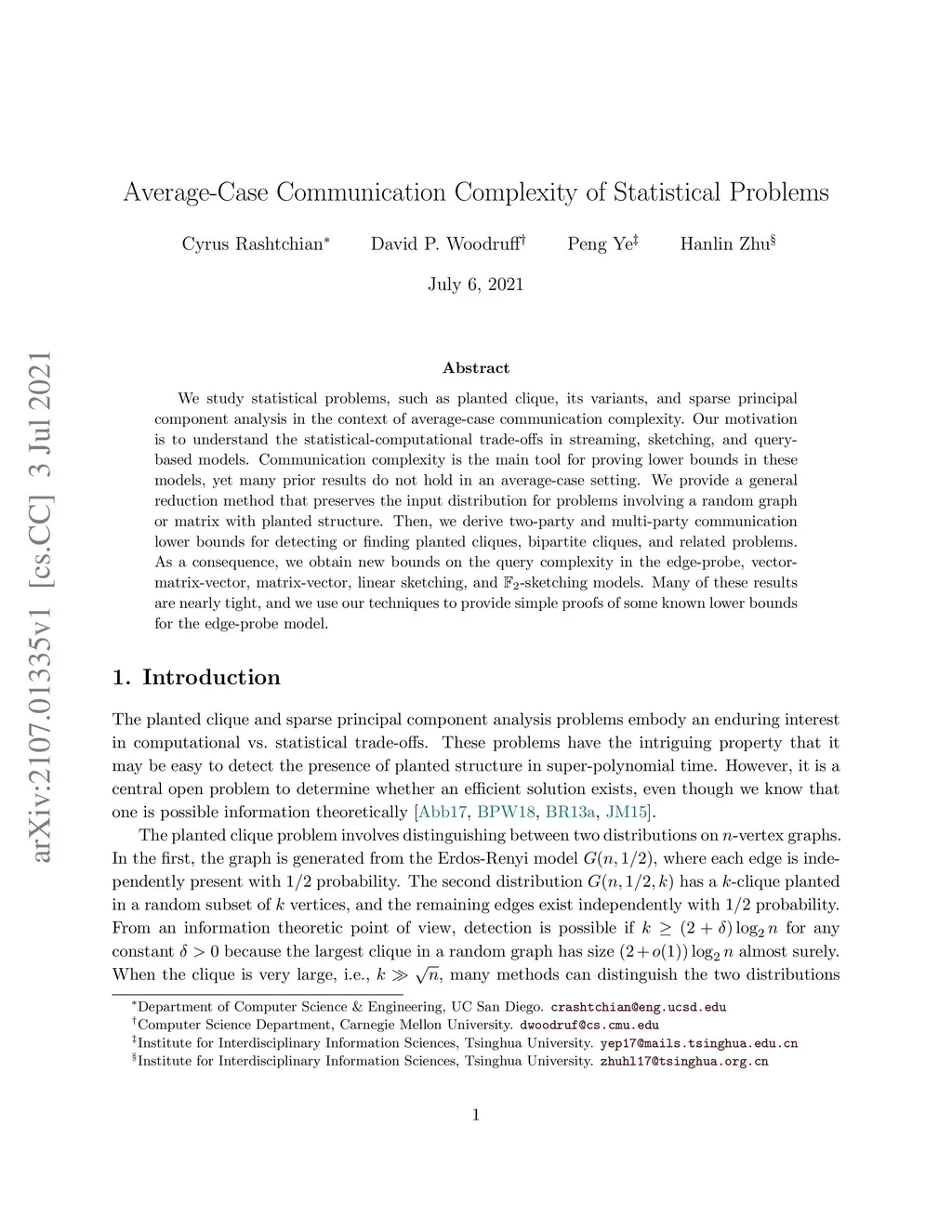 We study statistical problems, such as planted clique, its variants, and sparse principal component analysis in the context of average-case communication complexity. Our motivation is to understand the statistical-computational trade-offs in streaming, sketching, and query-based models. Communication complexity is the main tool for proving lower bounds in these models, yet many prior results do not hold in an average-case setting. We provide a general reduction method that preserves the input distribution for problems involving a random graph or matrix with planted structure. Then, we derive two-party and multi-party communication lower bounds for detecting or finding planted cliques, bipartite cliques, and related problems. As a consequence, we obtain new bounds on the query complexity in the edge-probe, vector-matrix-vector, matrix-vector, linear sketching, and -sketching models. Many of these results are nearly tight, and we use our techniques to provide simple proofs of some known lower bounds for the edge-probe model.