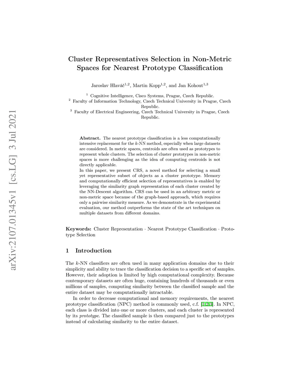 The nearest prototype classification is a less computationally intensive replacement for the -NN method, especially when large datasets are considered. In metric spaces, centroids are often used as prototypes to represent whole clusters. The selection of cluster prototypes in non-metric spaces is more challenging as the idea of computing centroids is not directly applicable. In this paper, we present CRS, a novel method for selecting a small yet representative subset of objects as a cluster prototype. Memory and computationally efficient selection of representatives is enabled by leveraging the similarity graph representation of each cluster created by the NN-Descent algorithm. CRS can be used in an arbitrary metric or non-metric space because of the graph-based approach, which requires only a pairwise similarity measure. As we demonstrate in the experimental evaluation, our method outperforms the state of the art techniques on multiple datasets from different domains.