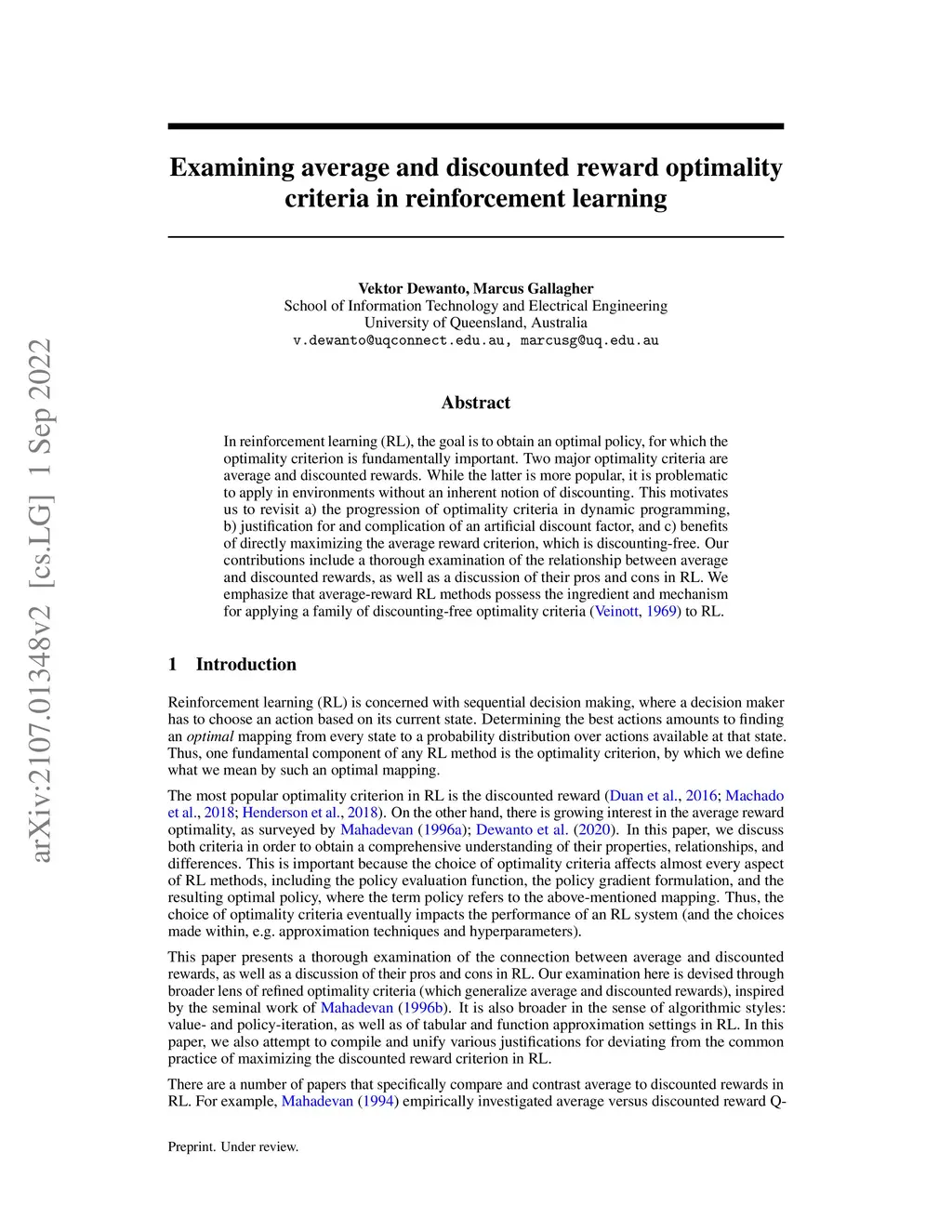 Examining average and discounted reward optimality criteria in