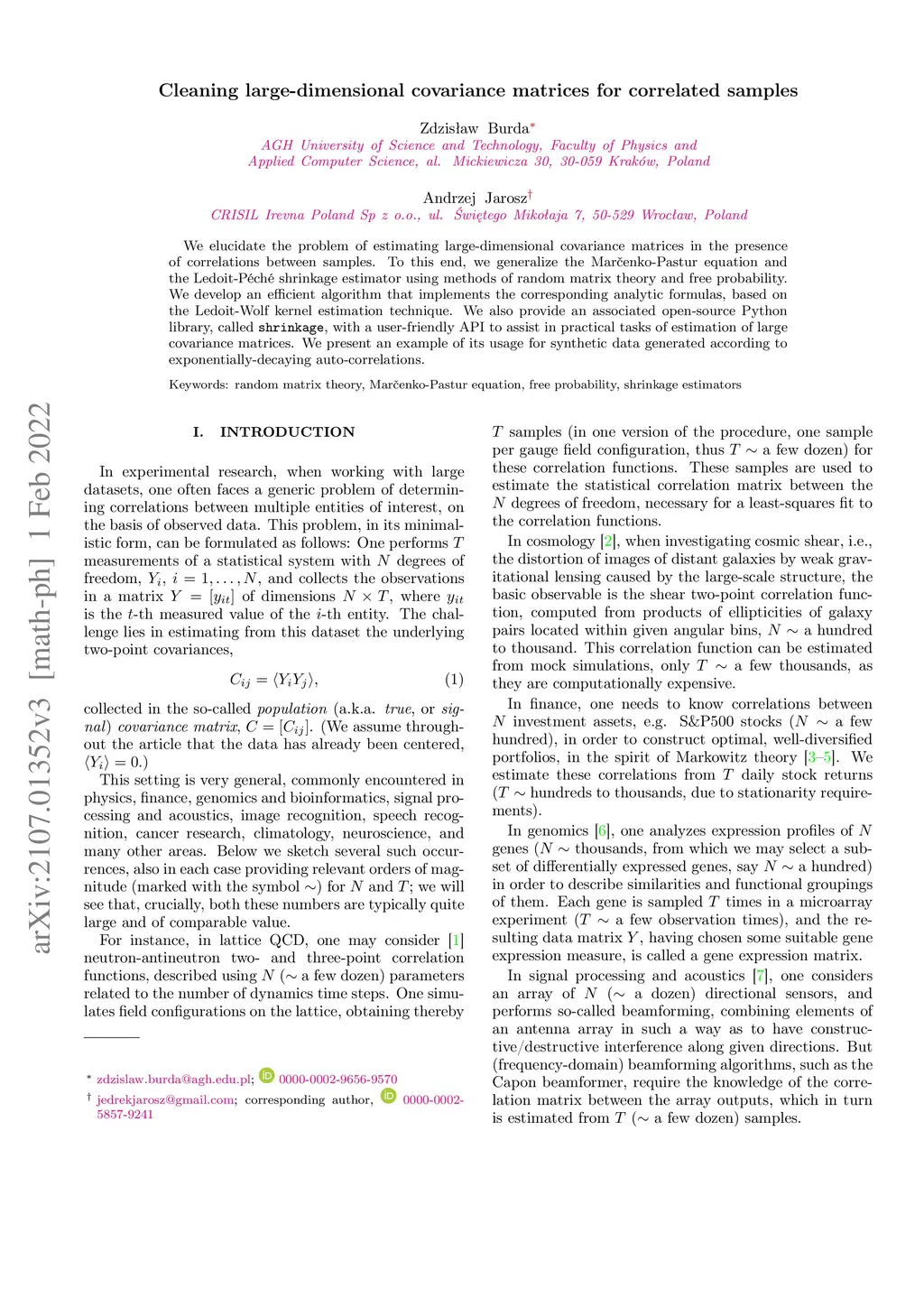 We elucidate the problem of estimating large-dimensional covariance matrices in the presence of correlations between samples. To this end, we generalize the Marcenko-Pastur equation and the Ledoit-Peche shrinkage estimator using methods of random matrix theory and free probability. We develop an efficient algorithm that implements the corresponding analytic formulas, based on the Ledoit-Wolf kernel estimation technique. We also provide an associated open-source Python library, called "shrinkage", with a user-friendly API to assist in practical tasks of estimation of large covariance matrices. We present an example of its usage for synthetic data generated according to exponentially-decaying auto-correlations.