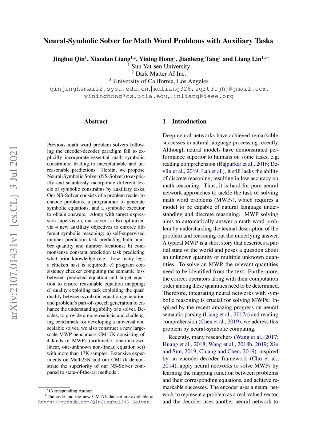 Previous math word problem solvers following the encoder-decoder paradigm fail to explicitly incorporate essential math symbolic constraints, leading to unexplainable and unreasonable predictions. Herein, we propose Neural-Symbolic Solver (NS-Solver) to explicitly and seamlessly incorporate different levels of symbolic constraints by auxiliary tasks. Our NS-Solver consists of a problem reader to encode problems, a programmer to generate symbolic equations, and a symbolic executor to obtain answers. Along with target expression supervision, our solver is also optimized via 4 new auxiliary objectives to enforce different symbolic reasoning: a) self-supervised number prediction task predicting both number quantity and number locations; b) commonsense constant prediction task predicting what prior knowledge (e.g. how many legs a chicken has) is required; c) program consistency checker computing the semantic loss between predicted equation and target equation to ensure reasonable equation mapping; d) duality exploiting task exploiting the quasi duality between symbolic equation generation and problem's part-of-speech generation to enhance the understanding ability of a solver. Besides, to provide a more realistic and challenging benchmark for developing a universal and scalable solver, we also construct a new large-scale MWP benchmark CM17K consisting of 4 kinds of MWPs (arithmetic, one-unknown linear, one-unknown non-linear, equation set) with more than 17K samples. Extensive experiments on Math23K and our CM17k demonstrate the superiority of our NS-Solver compared to state-of-the-art methods.