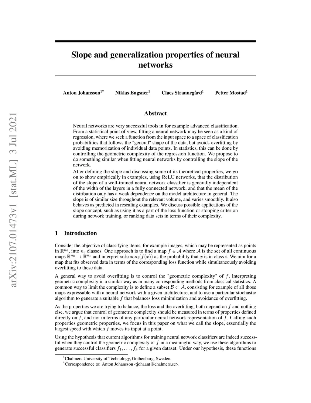 Neural networks are very successful tools in for example advanced classification. From a statistical point of view, fitting a neural network may be seen as a kind of regression, where we seek a function from the input space to a space of classification probabilities that follows the "general" shape of the data, but avoids overfitting by avoiding memorization of individual data points. In statistics, this can be done by controlling the geometric complexity of the regression function. We propose to do something similar when fitting neural networks by controlling the slope of the network. After defining the slope and discussing some of its theoretical properties, we go on to show empirically in examples, using ReLU networks, that the distribution of the slope of a well-trained neural network classifier is generally independent of the width of the layers in a fully connected network, and that the mean of the distribution only has a weak dependence on the model architecture in general. The slope is of similar size throughout the relevant volume, and varies smoothly. It also behaves as predicted in rescaling examples. We discuss possible applications of the slope concept, such as using it as a part of the loss function or stopping criterion during network training, or ranking data sets in terms of their complexity.