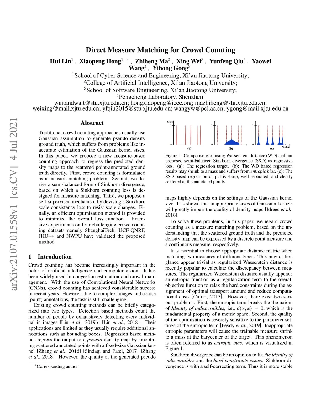 Traditional crowd counting approaches usually use Gaussian assumption to generate pseudo density ground truth, which suffers from problems like inaccurate estimation of the Gaussian kernel sizes. In this paper, we propose a new measure-based counting approach to regress the predicted density maps to the scattered point-annotated ground truth directly. First, crowd counting is formulated as a measure matching problem. Second, we derive a semi-balanced form of Sinkhorn divergence, based on which a Sinkhorn counting loss is designed for measure matching. Third, we propose a self-supervised mechanism by devising a Sinkhorn scale consistency loss to resist scale changes. Finally, an efficient optimization method is provided to minimize the overall loss function. Extensive experiments on four challenging crowd counting datasets namely ShanghaiTech, UCF-QNRF, JHU++, and NWPU have validated the proposed method.
