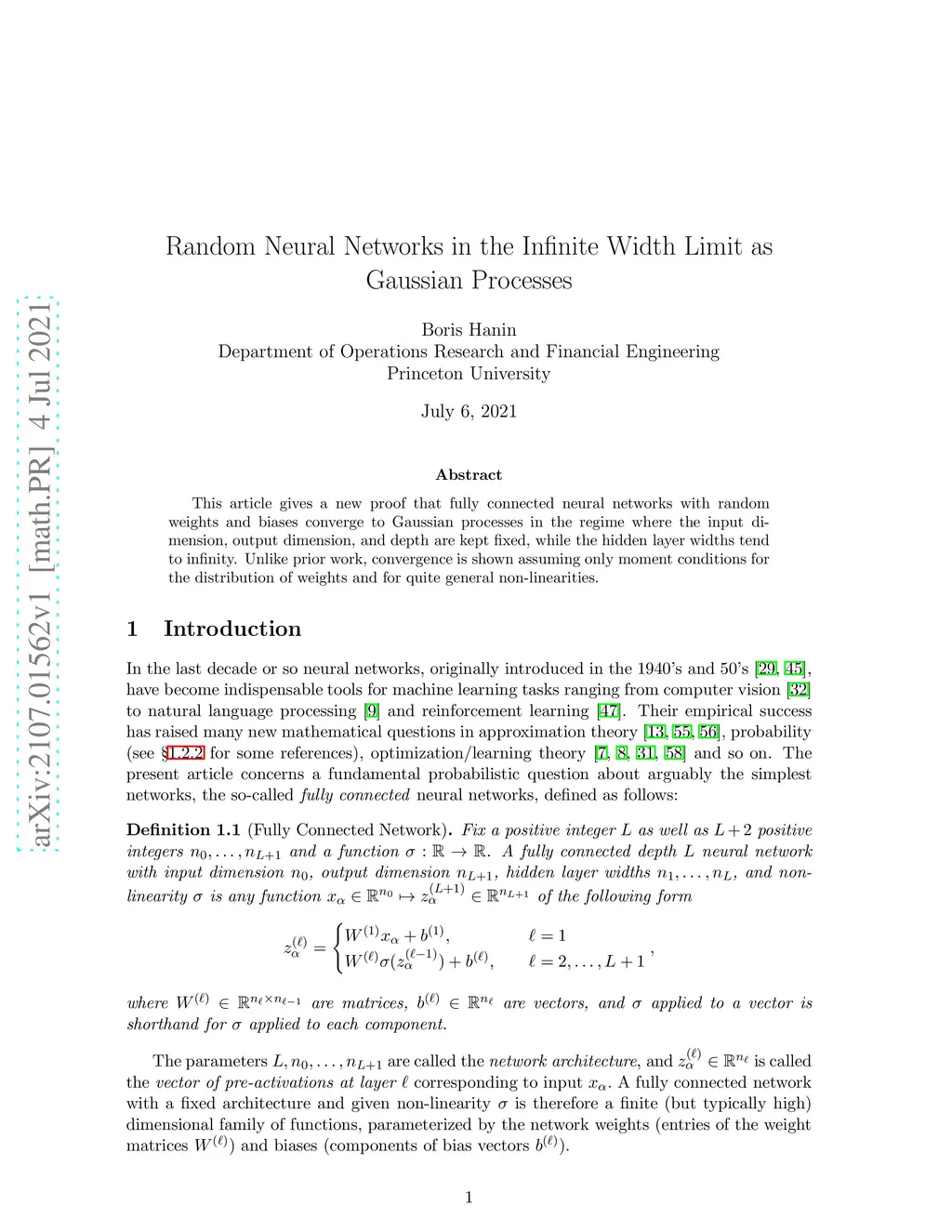 This article gives a new proof that fully connected neural networks with random weights and biases converge to Gaussian processes in the regime where the input dimension, output dimension, and depth are kept fixed, while the hidden layer widths tend to infinity. Unlike prior work, convergence is shown assuming only moment conditions for the distribution of weights and for quite general non-linearities.