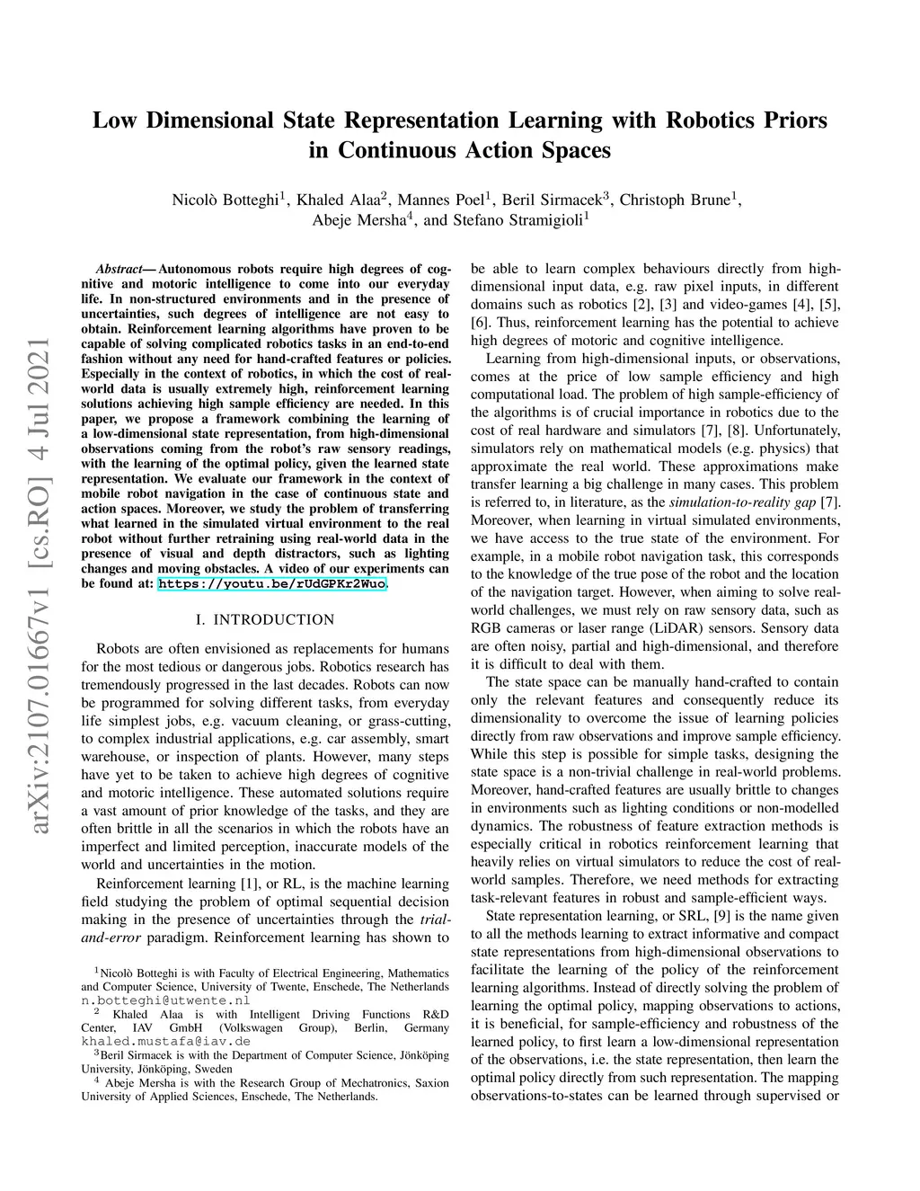 Autonomous robots require high degrees of cognitive and motoric intelligence to come into our everyday life. In non-structured environments and in the presence of uncertainties, such degrees of intelligence are not easy to obtain. Reinforcement learning algorithms have proven to be capable of solving complicated robotics tasks in an end-to-end fashion without any need for hand-crafted features or policies. Especially in the context of robotics, in which the cost of real-world data is usually extremely high, reinforcement learning solutions achieving high sample efficiency are needed. In this paper, we propose a framework combining the learning of a low-dimensional state representation, from high-dimensional observations coming from the robot's raw sensory readings, with the learning of the optimal policy, given the learned state representation. We evaluate our framework in the context of mobile robot navigation in the case of continuous state and action spaces. Moreover, we study the problem of transferring what learned in the simulated virtual environment to the real robot without further retraining using real-world data in the presence of visual and depth distractors, such as lighting changes and moving obstacles.