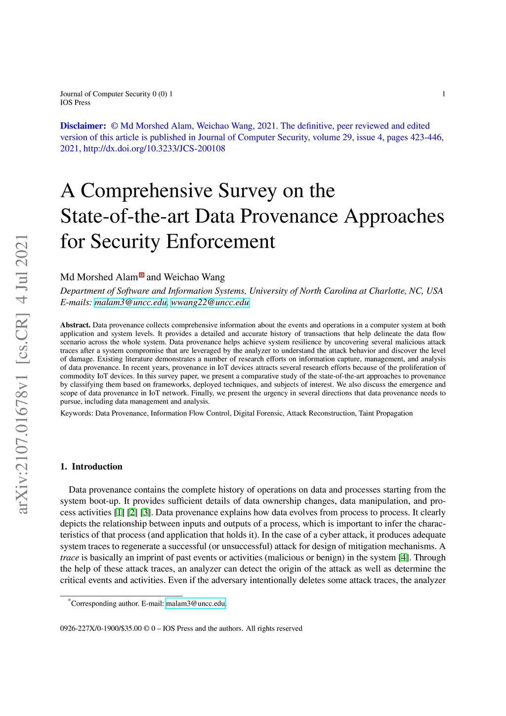 Data provenance collects comprehensive information about the events and operations in a computer system at both application and system levels. It provides a detailed and accurate history of transactions that help delineate the data flow scenario across the whole system. Data provenance helps achieve system resilience by uncovering several malicious attack traces after a system compromise that are leveraged by the analyzer to understand the attack behavior and discover the level of damage. Existing literature demonstrates a number of research efforts on information capture, management, and analysis of data provenance. In recent years, provenance in IoT devices attracts several research efforts because of the proliferation of commodity IoT devices. In this survey paper, we present a comparative study of the state-of-the-art approaches to provenance by classifying them based on frameworks, deployed techniques, and subjects of interest. We also discuss the emergence and scope of data provenance in IoT networks. Finally, we present the urgency in several directions that data provenance needs to pursue, including data management and analysis.